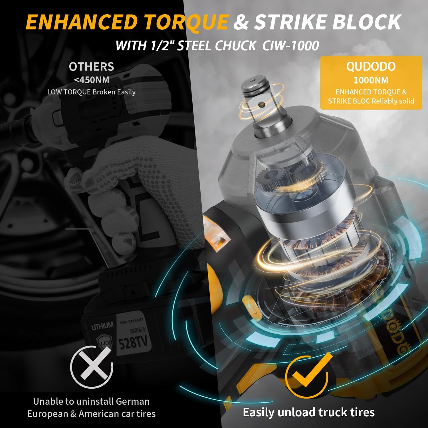 - SUITABLE FOR 99.99% OF JOB REQUIREMENTS - QUDODO's llave de impacto has 740Ft-lbs of terrifying torque, it is designed for heavy-duty work, suitable for removing tires from cars, trucks, and trailers, automotive repairs, architectural steelwork, scaffolding, DIY carpentry, home repairs, workshops, large-scale construction projects, heavy equipment maintenance, or product assembling