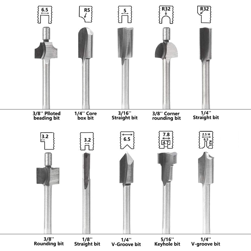 - Multi-style: 10Pcs/set of most commonly used router bit types including straight, trim, V groove, beading, cove, slot cutter and more, a great engraving bits single flute replacements for your CNC machinery