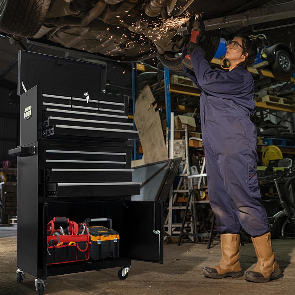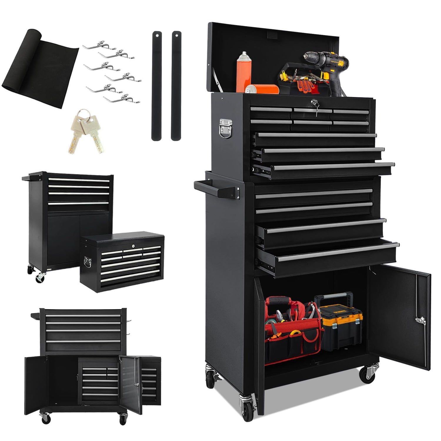 SONLMIK 13-Drawer Rolling Tool Chest with Double Door Handle, 2-in-1 Detachable Metal Storage Cabinet with Wheels and Lock, Large Capacity Tool Box for Garage, Home, Warehouse, Basement(Black)