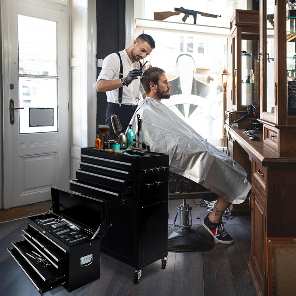 - EASY ASSEMBLY and REMOVABLE: This tool chest can be disassembled into two parts. The top chest tool box fits into the base cabinet to save space and features an independent locking system. Equipped with 4 universal casters (2 with brakes) for easy mobility and storage, this rolling tool cabinet can be effortlessly moved around. The top chest has handles for lifting, and the cabinet door includes 6 movable hooks and 3 rows of holes for extra storage.