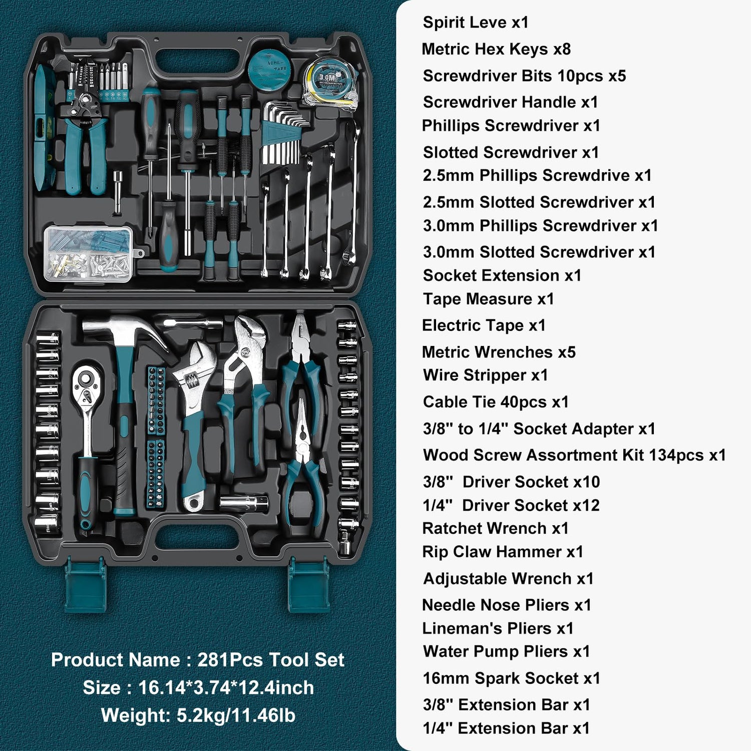 • 【Wide range of tools】 - Toolkit includes a claw hammer, level, tape measure(Metric and Imperial), hex key sets, Wire Stripper, Screwdrivers, water pump plier, Ratchet Wrench set, adjustable wrench,Combination Wrenchs, Needle Nose Plier, wire plier, diagonal plier, precision screwdrivers, cable ties, electrical tape, Wood Screw Assortment Kit.
