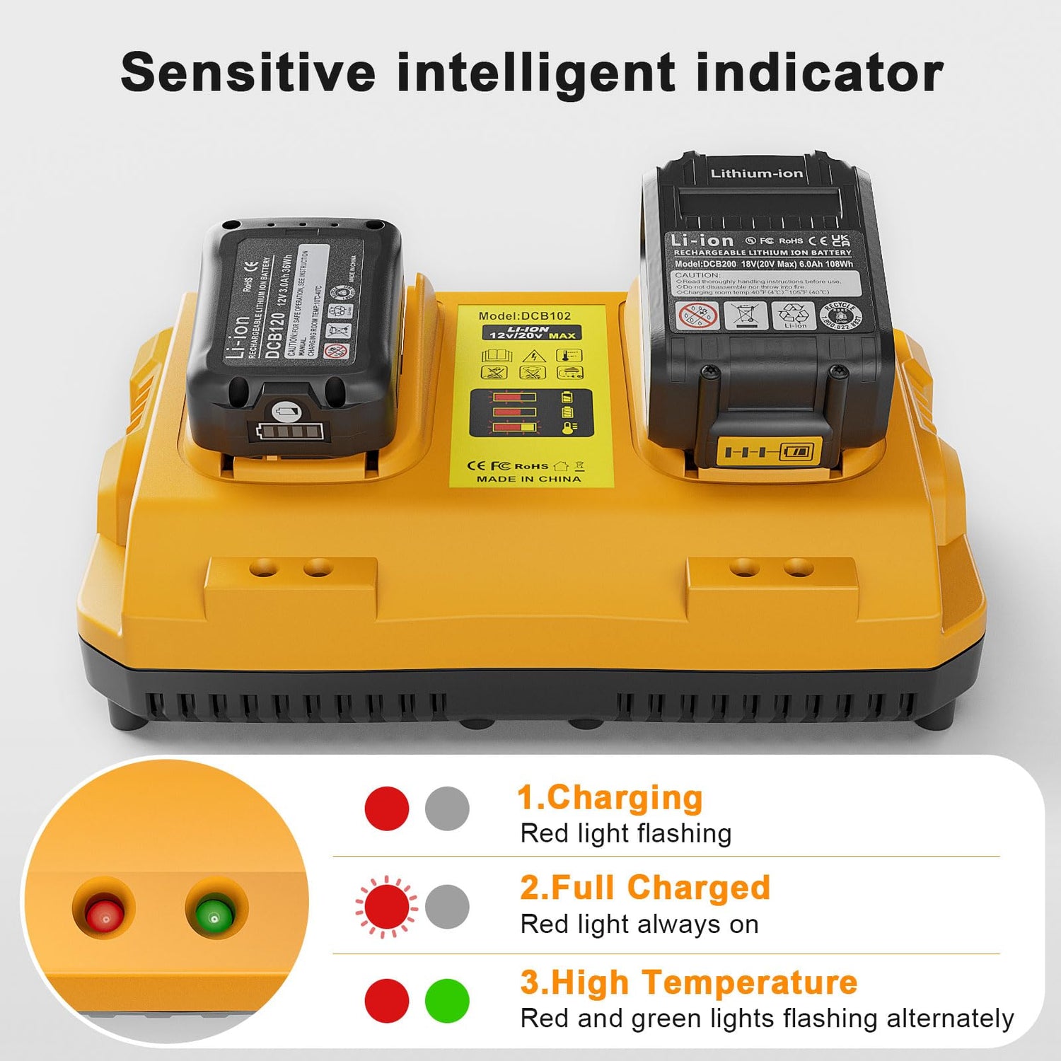 TeenPower 12/20V Max Battery Charger Replacement for Dewalt DCB102 Compatible with 12V 20V Max Lithium Battery DCB124 DCB203 DCB204 DCB606, 2-Port Simultaneous Charging