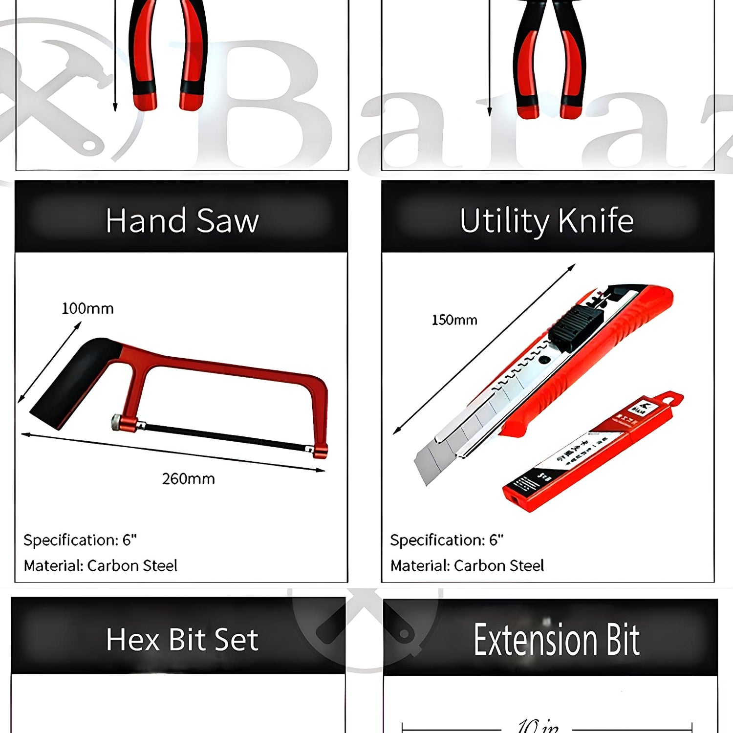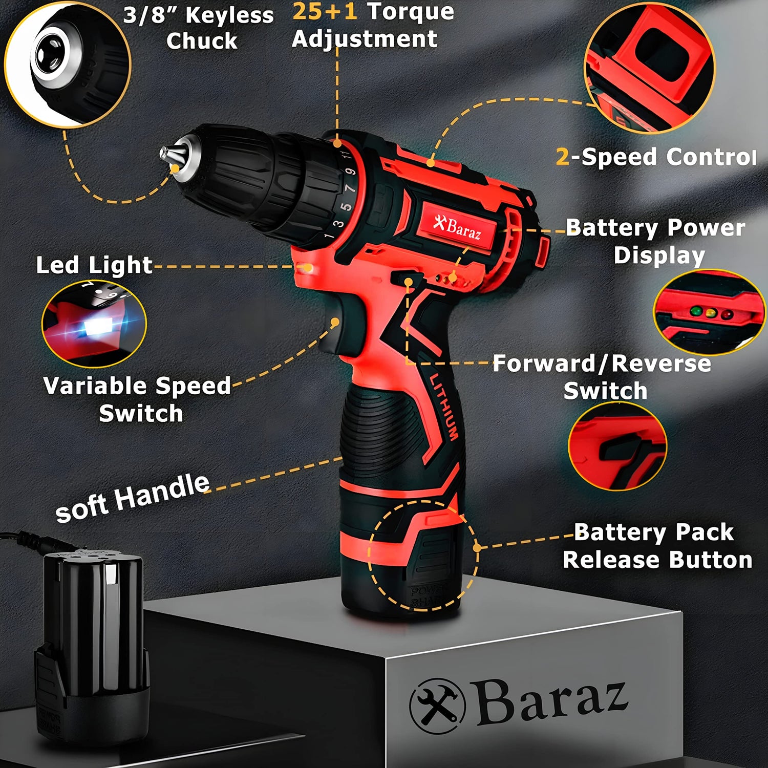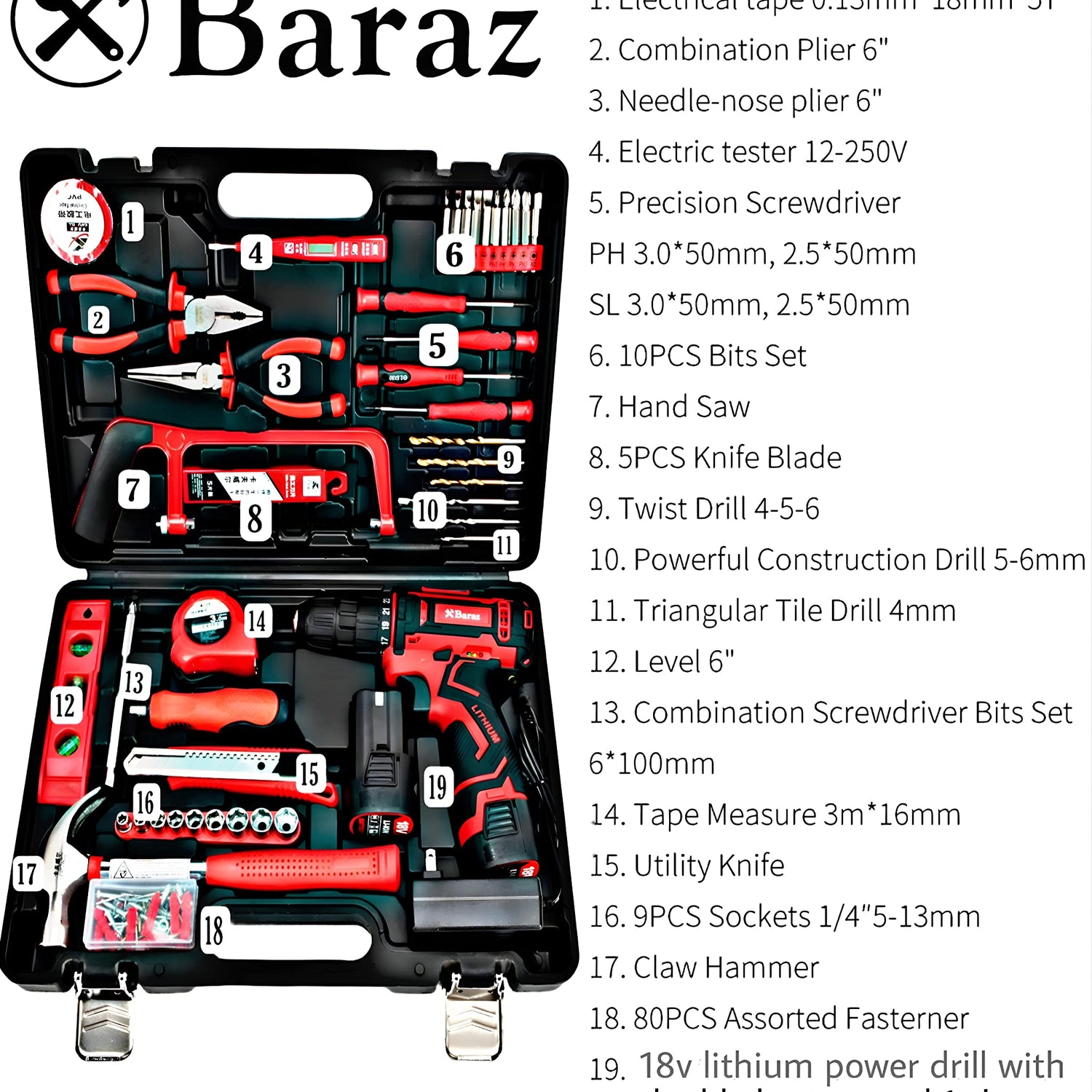 - All-in-one ESSENTIAL HAND TOOLS: With 126 pieces in one easy portable case, the Baraz professional 18v cordless Drill Driver & the all purpose hand tools combo Kit are the ultimate toolbox you need for all your DIY (do it yourself) repairs from putting up fixtures and fittings to assembling flat-pack furniture. It's the perfect accessories tool kit for repairing or maintaining everything around your house, garage, office, yard...