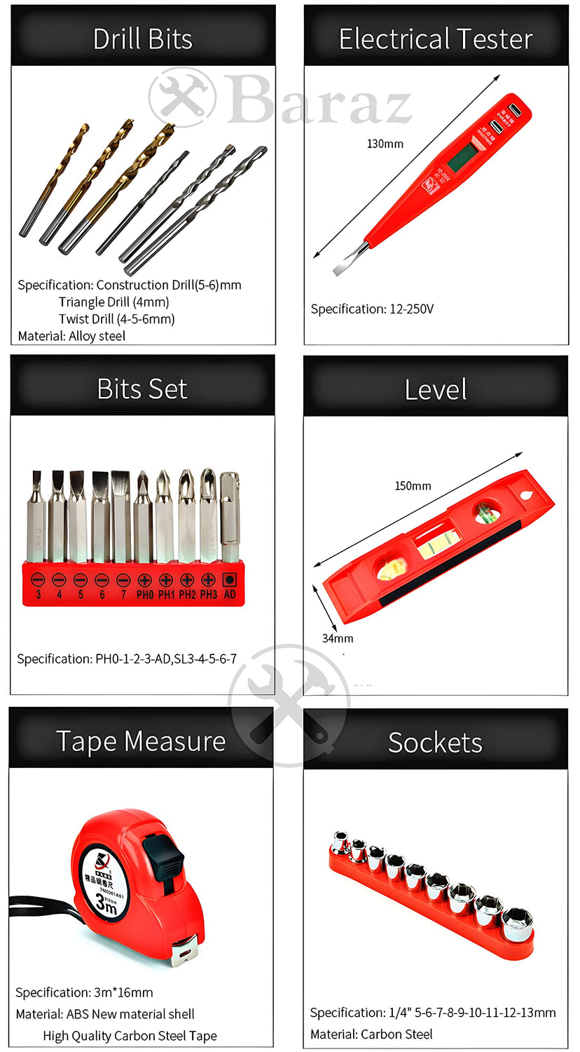 Details: With 126 pieces in one easy portable case, the Baraz professional 18v cordless Drill Driver & the all-purpose hand tools combo Kit are the ultimate toolbox you need for all your DIY (do it yourself) repairs from putting up fixtures and fittings to assembling flat-pack furniture. It's the perfect combo tool set for repairing or maintaining everything around your house, garage, office, yard... PACKAGE CONTENTS 1PC 18V Lithium-ion drill ( double battery pack ) 1PC Tape 0.13MM * 18MM * 5Y 10PCS Batch head set 50MM long 1PC Electricity measuring pen 12-250V 1PC Steel wire pliers 6 " 1PC Sharp nose pliers 6 " 1PC Artisan knife 6 " 4PCS Watch batch (SL3.0 * 50MM , SL2.5 * 50MM , PH 0 * 50MM , PH 00 50MM) 1PC Saw stand 6 " 5PCS Hobby knife blade 18 * 100MM 3PCS Twist drill 4-5-6 2PCS Strong builder's drill 5-6MM 1PC Horizontal ruler 6 " 1PC Fine tape measure 3MX16MM 1PC Dual-use screwdriver 6 * 100MM 9PCS Socket set 1/45-13MM 1PC Steel pipe handle crook hammer 8oz 80PCS Hardware box 1PC Triangle tile drill 4MM 80PCS assorted fastener