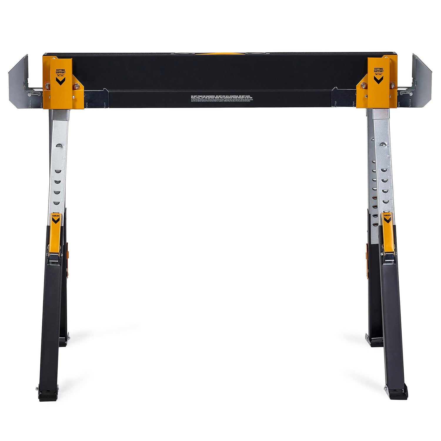 - CREATE A STURDY JOBSITE TABLE - Support arms fit 2x4s and 4x4s. When deployed transform two sawhorses into a solid and sturdy jobsite table. Adjustable height legs quickly configure to your work. Has quality material support pegs and pivoting feet that adjust to your needs. Also includes innovative cutting brackets for safe and easy cutting of different materials.