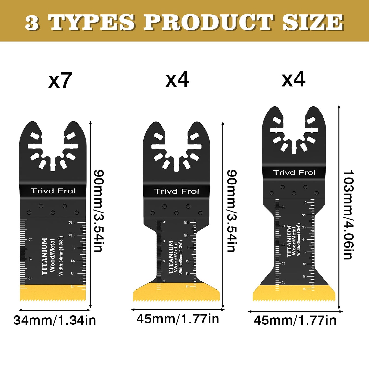 - 【3 Types 15 PCS】: The Titanium oscillating saw blades metal cutting set includes: 7pcs 1-3/8 inch saw blade, 4pcs 1-3/4 inch saw blade and 4pcs Extended 1-3/4 inch saw blade. Various types of Titanium oscillating multitool blades can meet your various cutting needs.