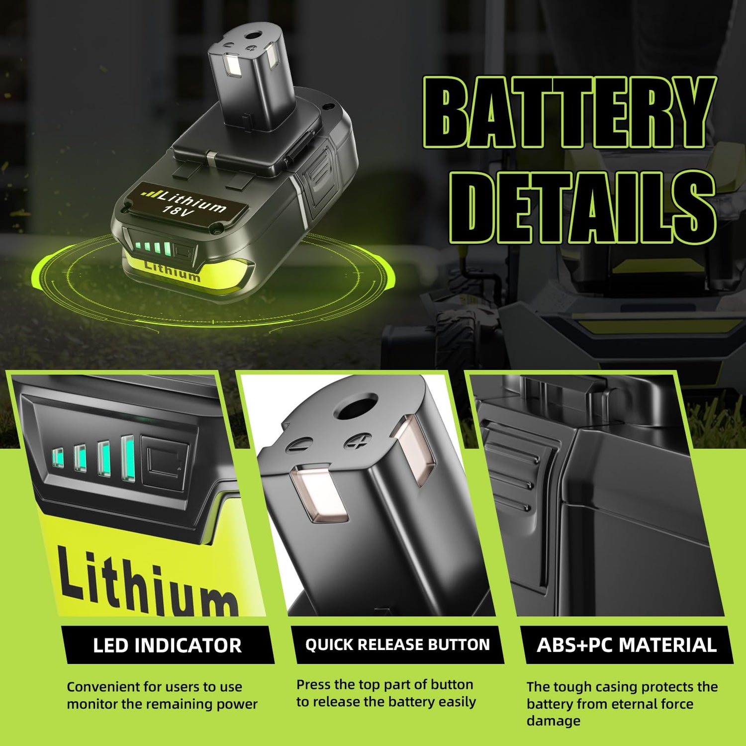 - LED Power Indicator - Our 18V lithium battery features a clear power indicator, keeping you informed about the remaining charge and reminding you to recharge when needed.