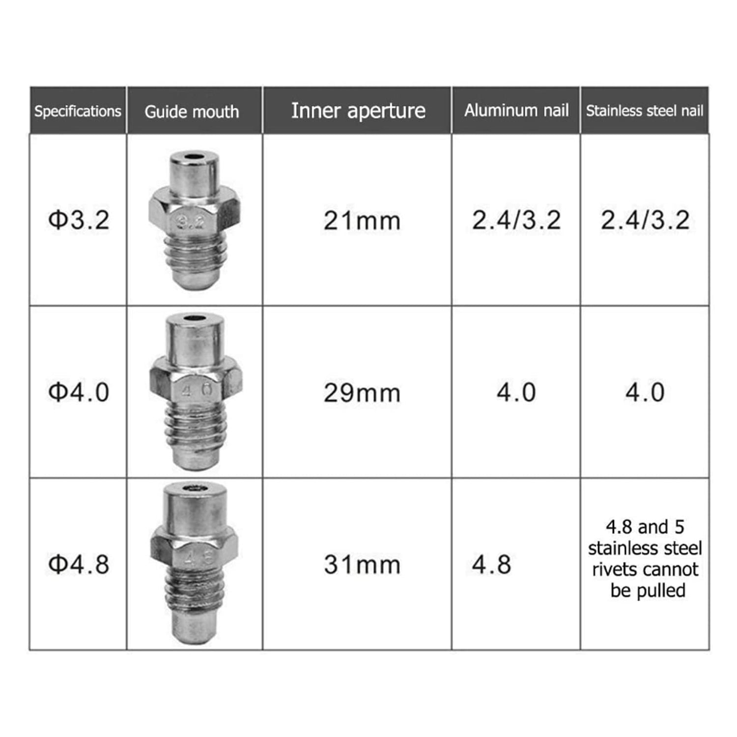 Applicable Rivet Specifications: Approx. 3.2-4.8mm / 0.1-0.2in