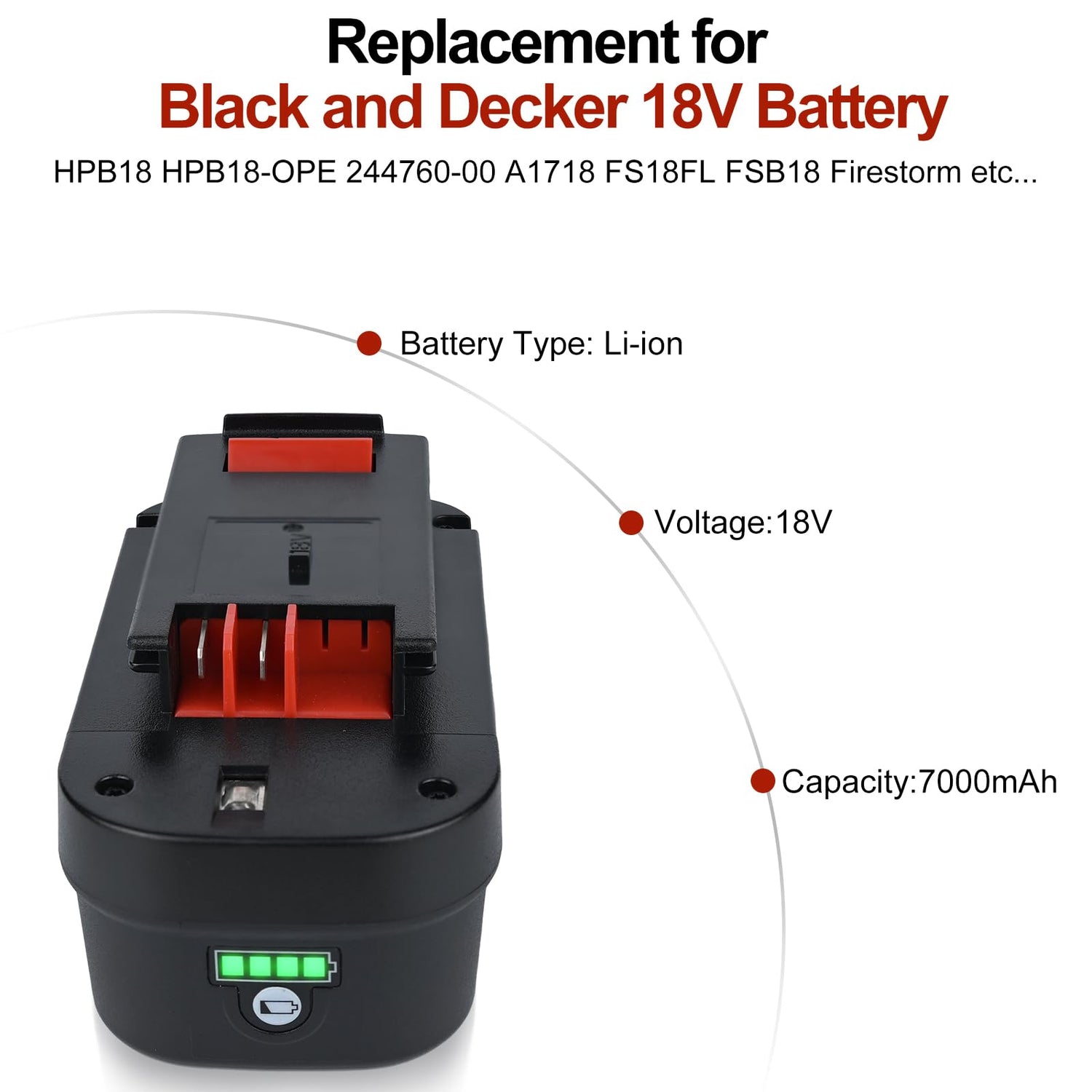 - BATTERY SPECIFICATIONS- Capacity: 7000mAh; Voltage: 18v; Battery type: Lithium-ion; Black and Decker 18v Lithium Battery Replacement.