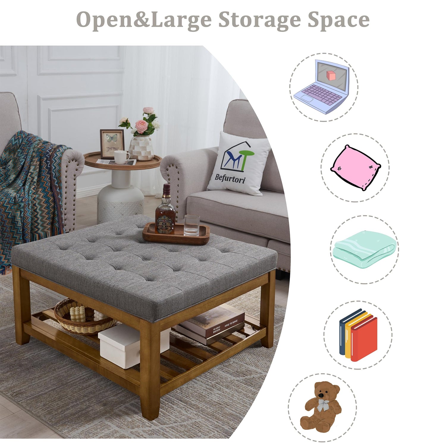 Befurtori Upholstered Coffee Table Tufted Linen Large Square Ottoman with Beech Wood Shelf and Frame, Oversized Footrest Ottoman for Living Room, Granite
