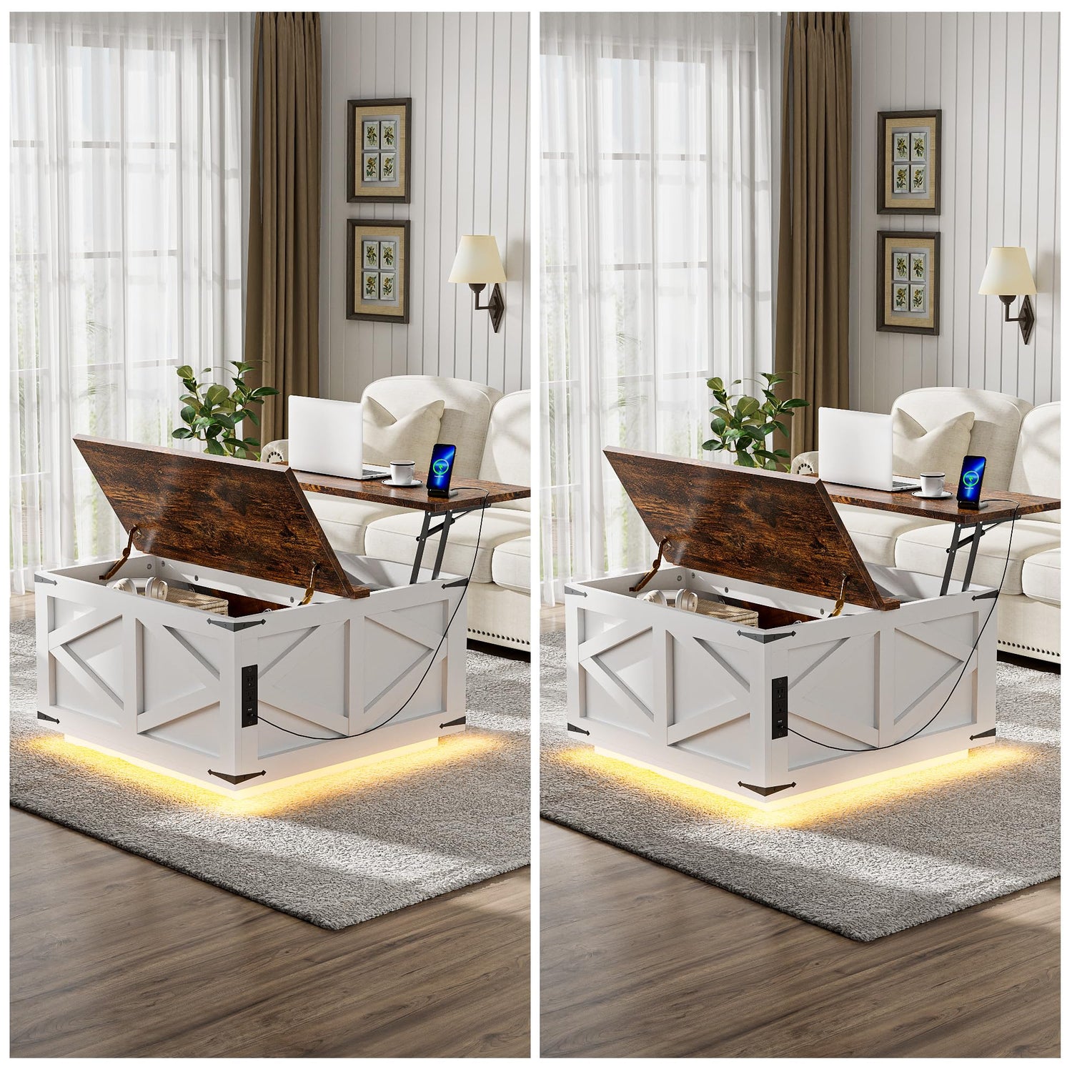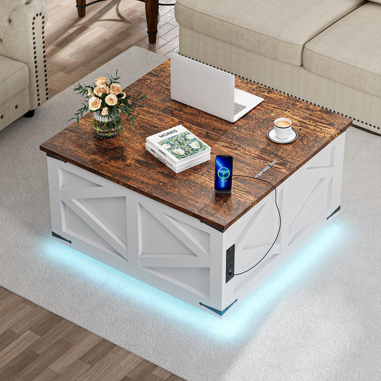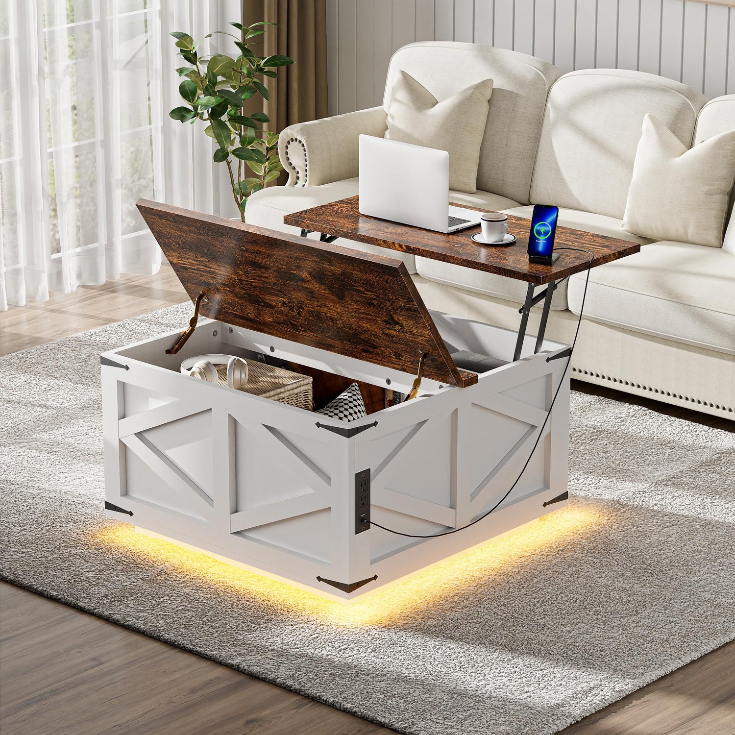 Dutsalrun Lift-Up Coffee Table with LED Storage and Charging Station | Farmhouse Square Lift-Up Table | Living Room Bench with Hidden Storage