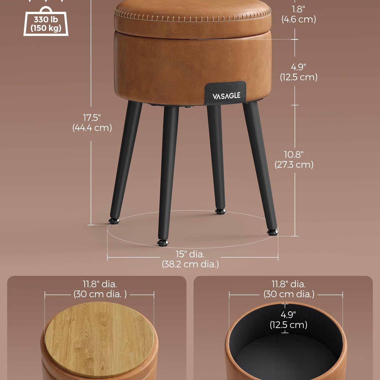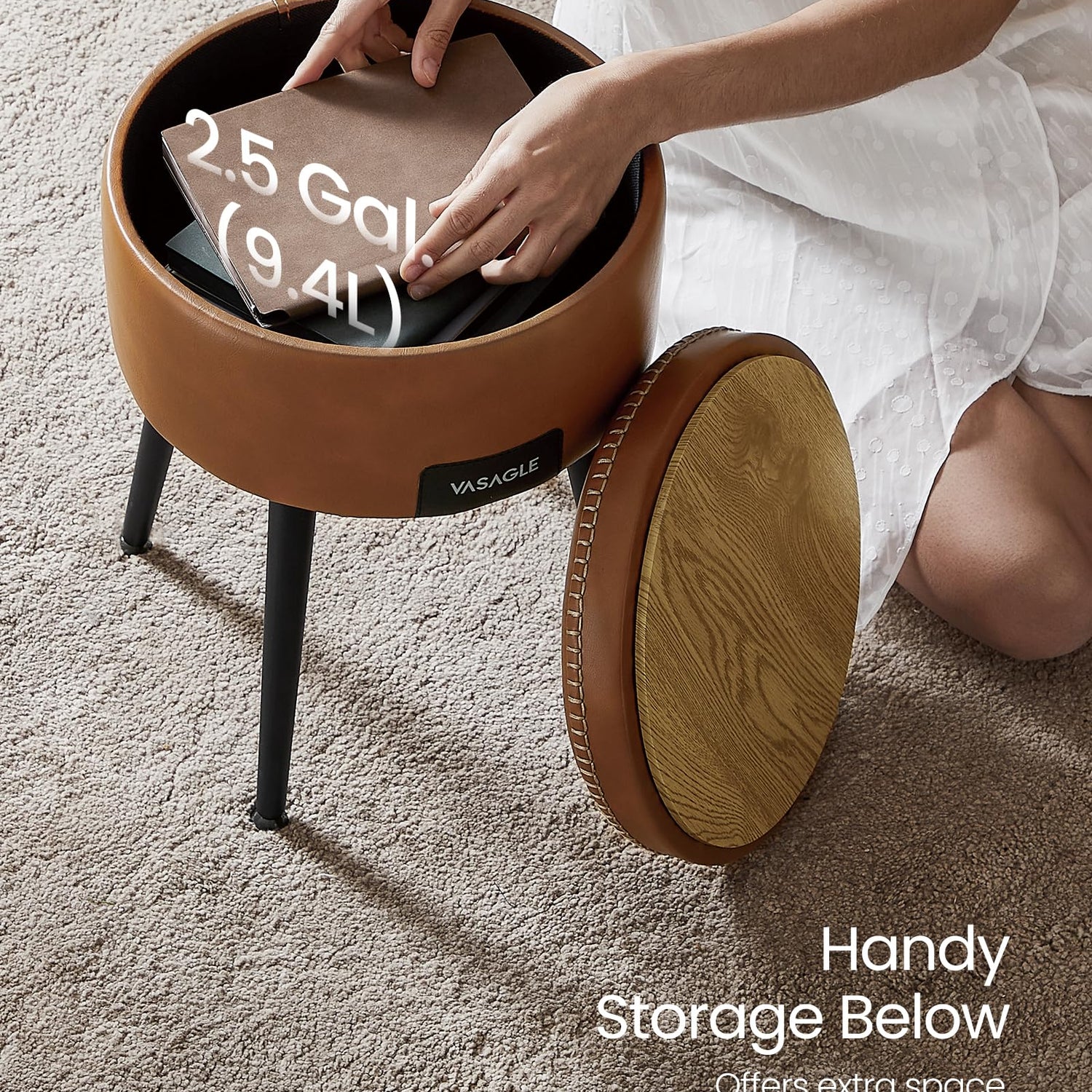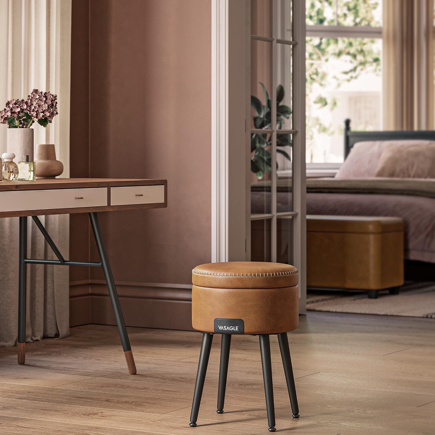 VASAGLE EKHO Collection - Storage Ottoman, Vanity Chair Stool, Synthetic Leather with Stitching, Mid-Century Modern, Round Storage Seat with Steel Legs, Loads 330 lb, Caramel Brown ULOM005K01