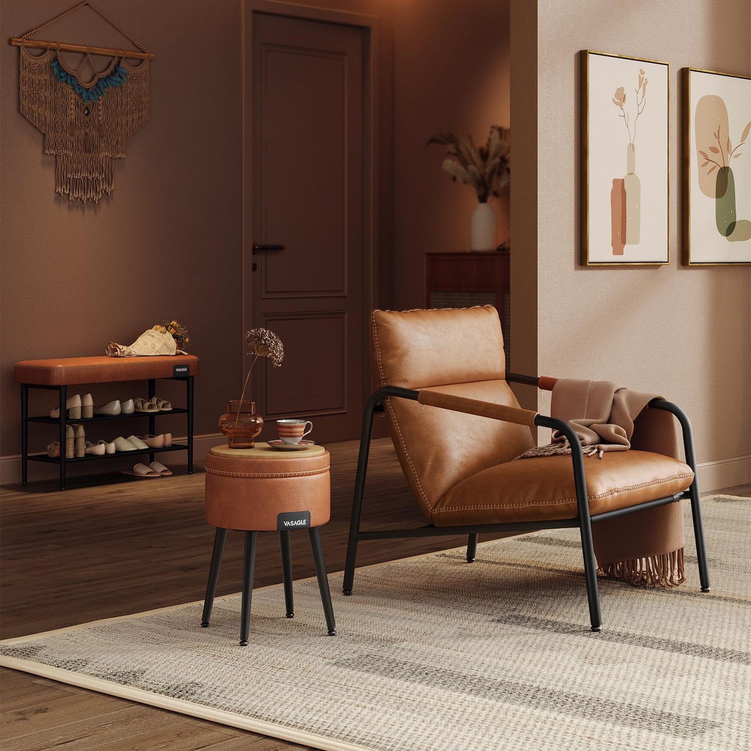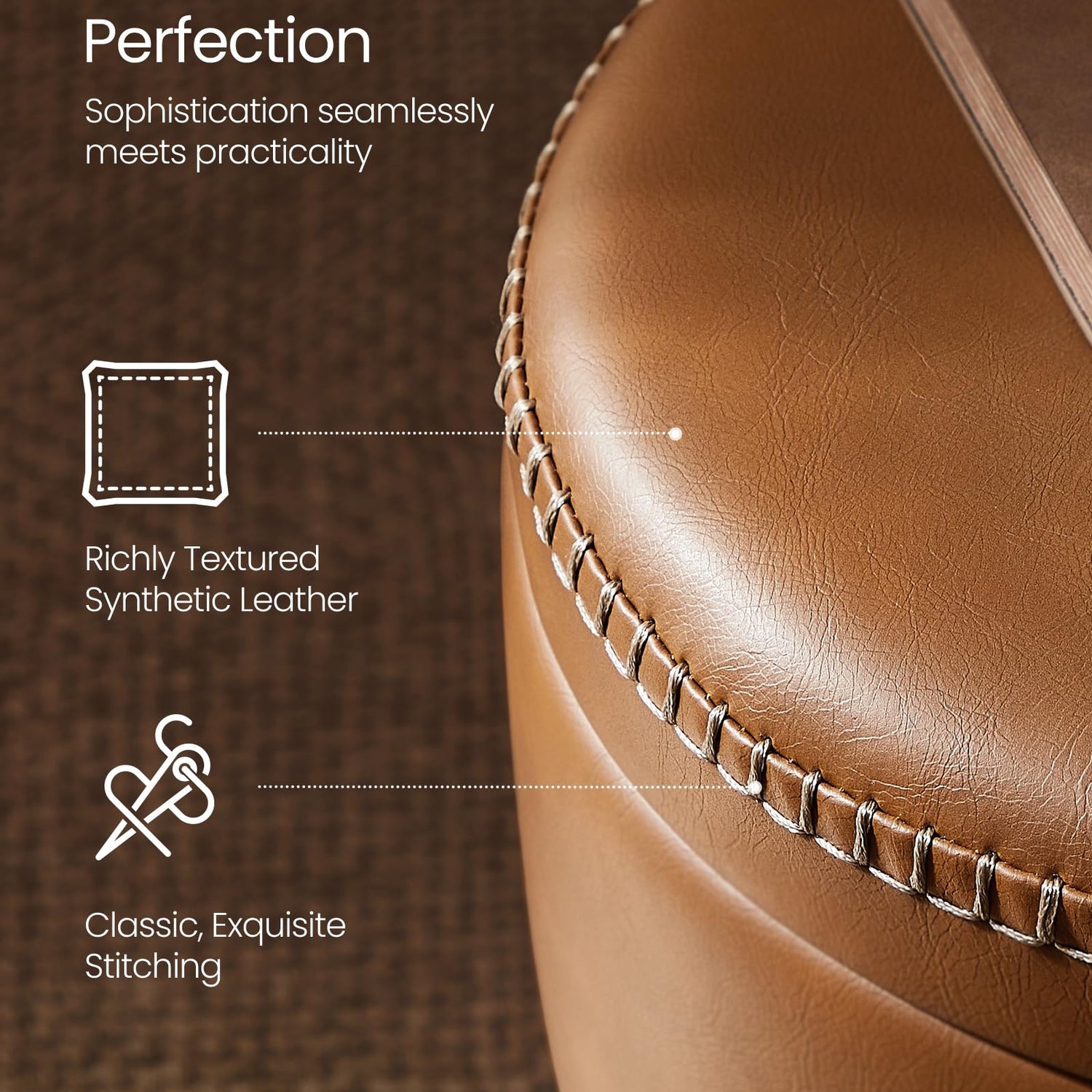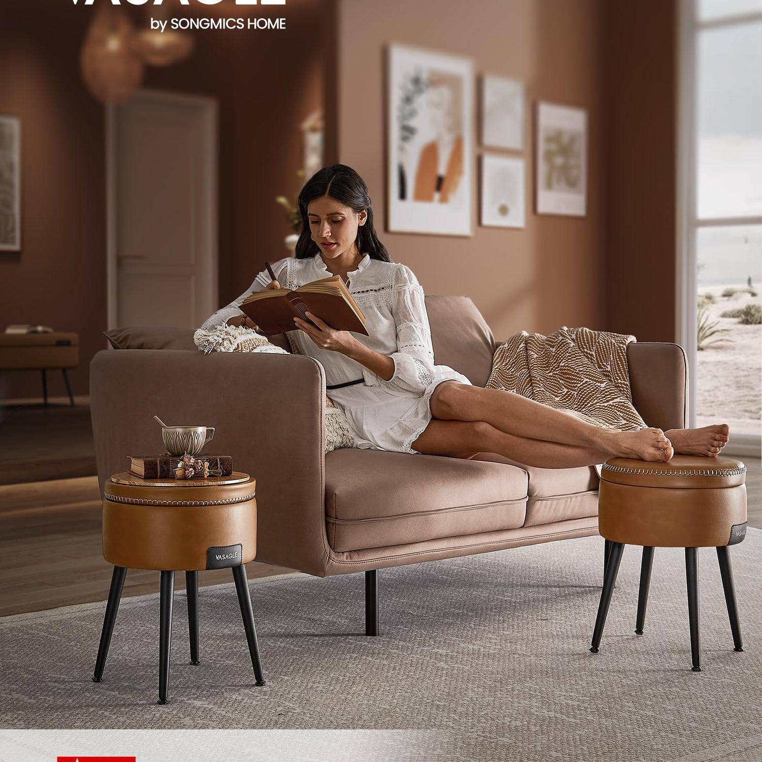VASAGLE EKHO Collection - Storage Ottoman, Vanity Chair Stool, Synthetic Leather with Stitching, Mid-Century Modern, Round Storage Seat with Steel Legs, Loads 330 lb, Caramel Brown ULOM005K01
