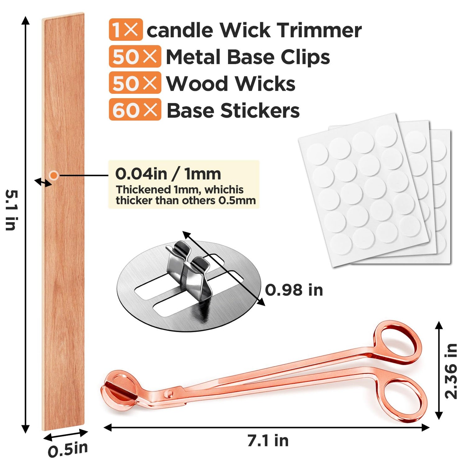 • Package And Size: 50pcs natural candle wicks with 50 pcs metal base, 60pcs base stickers, and a rose gold candle wick trimmer. The size of each candle wick is 5.1 x 0.5x0.04 inches (13x1.3x0.1 cm ), which is thicker than others. You can make a wider candle or just make a smaller one as long as you trim the wick.