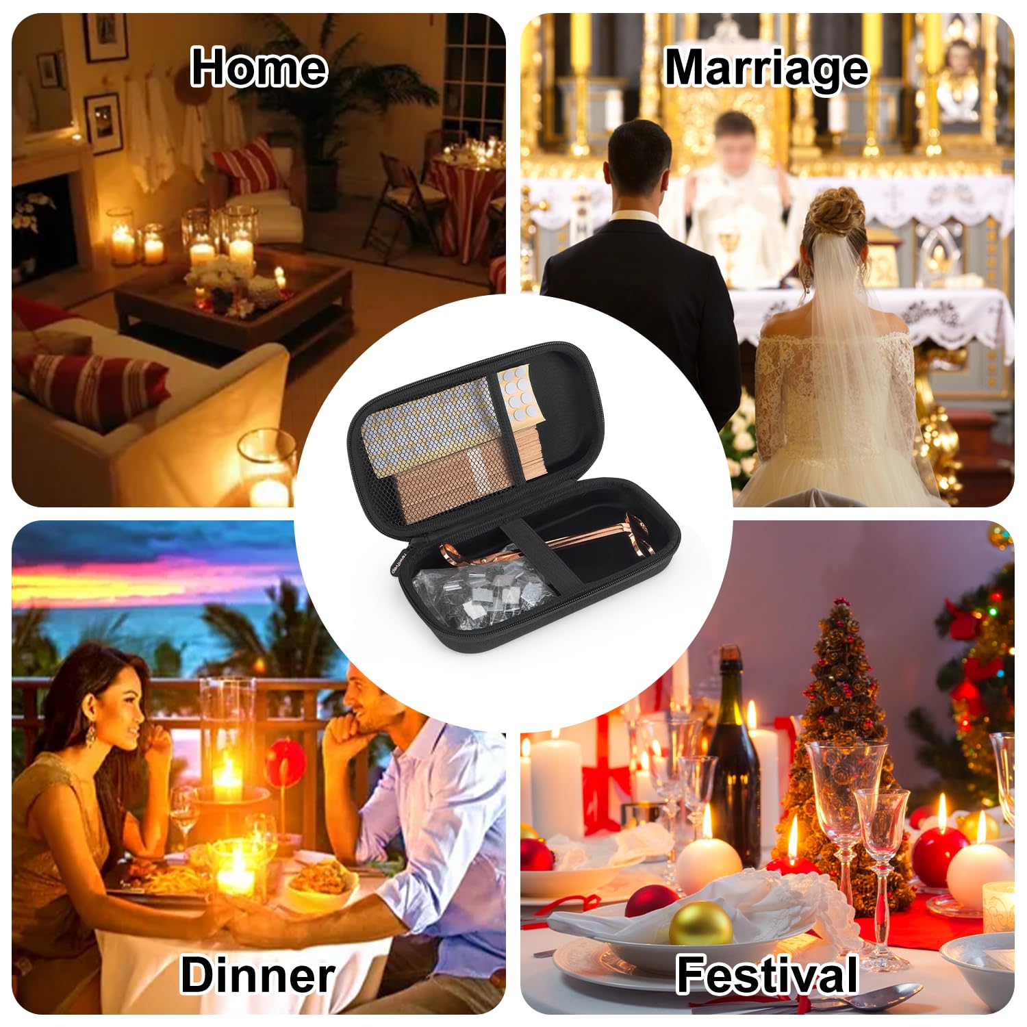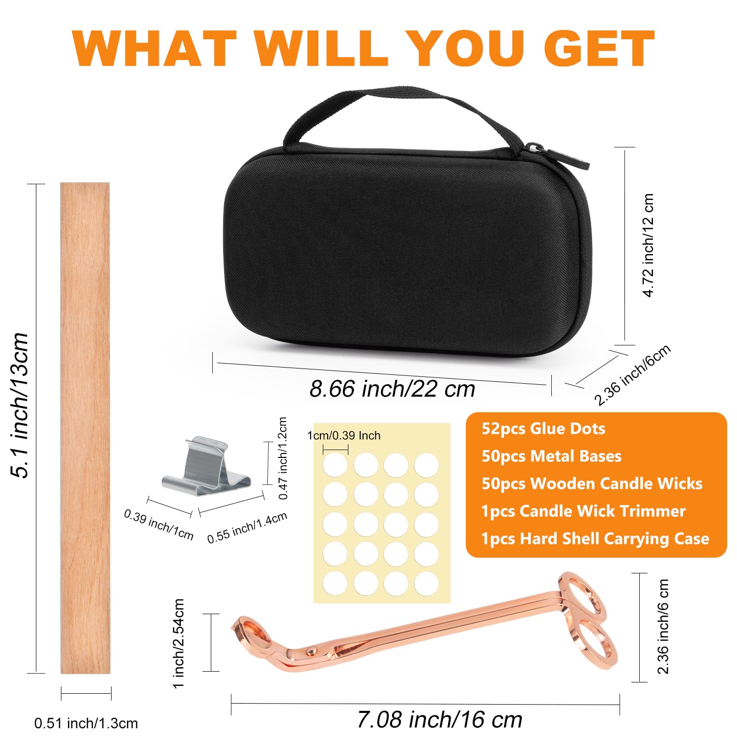 • 【Wood Wicks for Candles Making(50 Sets)】 Those candle wicks for candle making come in one case including 1 candle wick trimmer, 50pcs wood candle wicks, 50pcs metal base, 52pcs glue dots, fit for most candle making wicks and candle jars ( paraffin wax candles, beeswax candles, soybean wax candles, palm wax candles, coconut wax candles, and gel wax candles, and various DIY candles). The hard shell case is easy to carry and store, solving the problem of messy stacking of tools in the set.