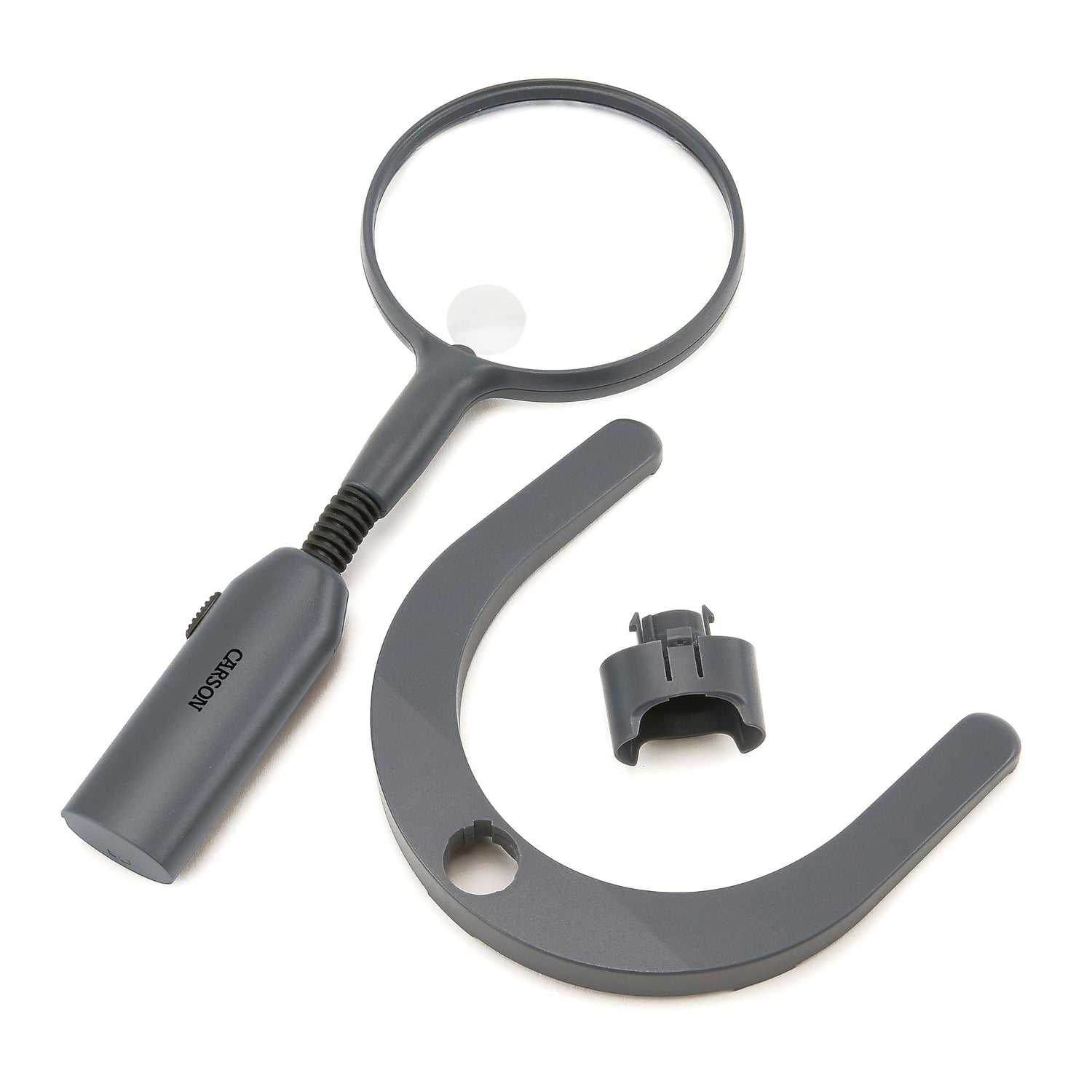 Details: The MagniLamp (GN-55) from Carson is a fully adjustable hand-held or hands-free magnifying lamp with a scratch resistant oversized acrylic lens (Lens Diameter: 4.0 inches). This magnifying glass has a 2x power magnification with a 3.5x power spot lens. It is compact and lightweight and makes for a great low vision reading aide. The MagniLamp is perfect for any desktop or workbench. It is LED lighted with 2 super bright LED lights. The MagniLamp is powered by 2 AA batteries (not included). The flexible, fully adjustable neck allows you to position the magnifier lens to the point where you need it most. The MagniLamp is extremely versatile and can be used for reading fine print, labels, books, magazines, coupons, model building, hobbies, soldering, arts, crafts, needlework and other tasks. Use the 3.5x power spot lens for close inspection of currency, coins, stamps, insects, wildlife, small electronics and more! The MagniLamp is backed by Carson. At Carson, we strive to make sure our customers are 100% satisfied with the quality of our magnifiers. Carson will repair or replace your magnifier if it is found to have manufacturing defects in materials or workmanship..