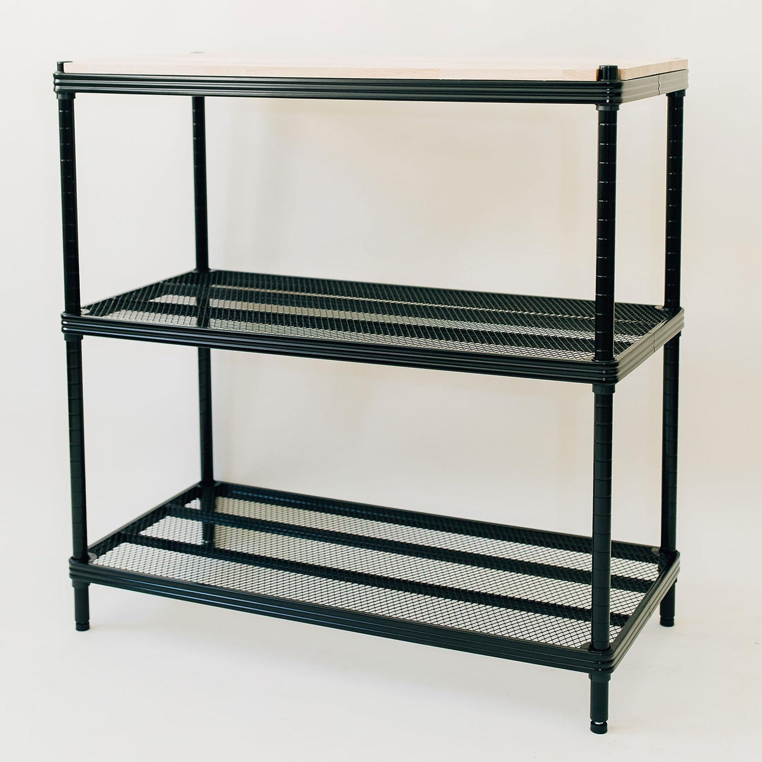 Get organized with the MeshWorks Metal Storage Wood Top Workbench Shelving Unit from Design Ideas. Built with your storage needs in mind, this garage accessory can be used in a wide variety of places. Put this storage essential in either your garage, kitchen, or office to organize tools, pantry items, gardening supplies, office accessories, and so much more. Featuring a heavy-duty steel metal mesh design and epoxy coating, each shelf from this standing shelf unit is capable of holding up to 440 pounds. With the expanded metal mesh shelving, this multipurpose display shelf rack will not let bottles, cans, or other small items fall through. This shelving rack for pantry storage gives you the ability to customize your space as you can add caster wheels (sold separately) giving you your own unique storage freedom. Each heavy-duty shelving rack is easy to assemble with no tools required and comes with 3 shelves, 4 pole sections, 12 sets of shelf clips, 4 plastic caps, 4 leveling feet, 1 wood top, and assembly instructions. Achieve both functionality and a sleek, classic look in any room with the metal storage unit's thoughtful design. Great for apartments, storage units, basements, living rooms, and more, you can get the most out of your storage space with the Design Ideas MeshWorks Metal Storage Wood Top Workbench Shelving Unit.