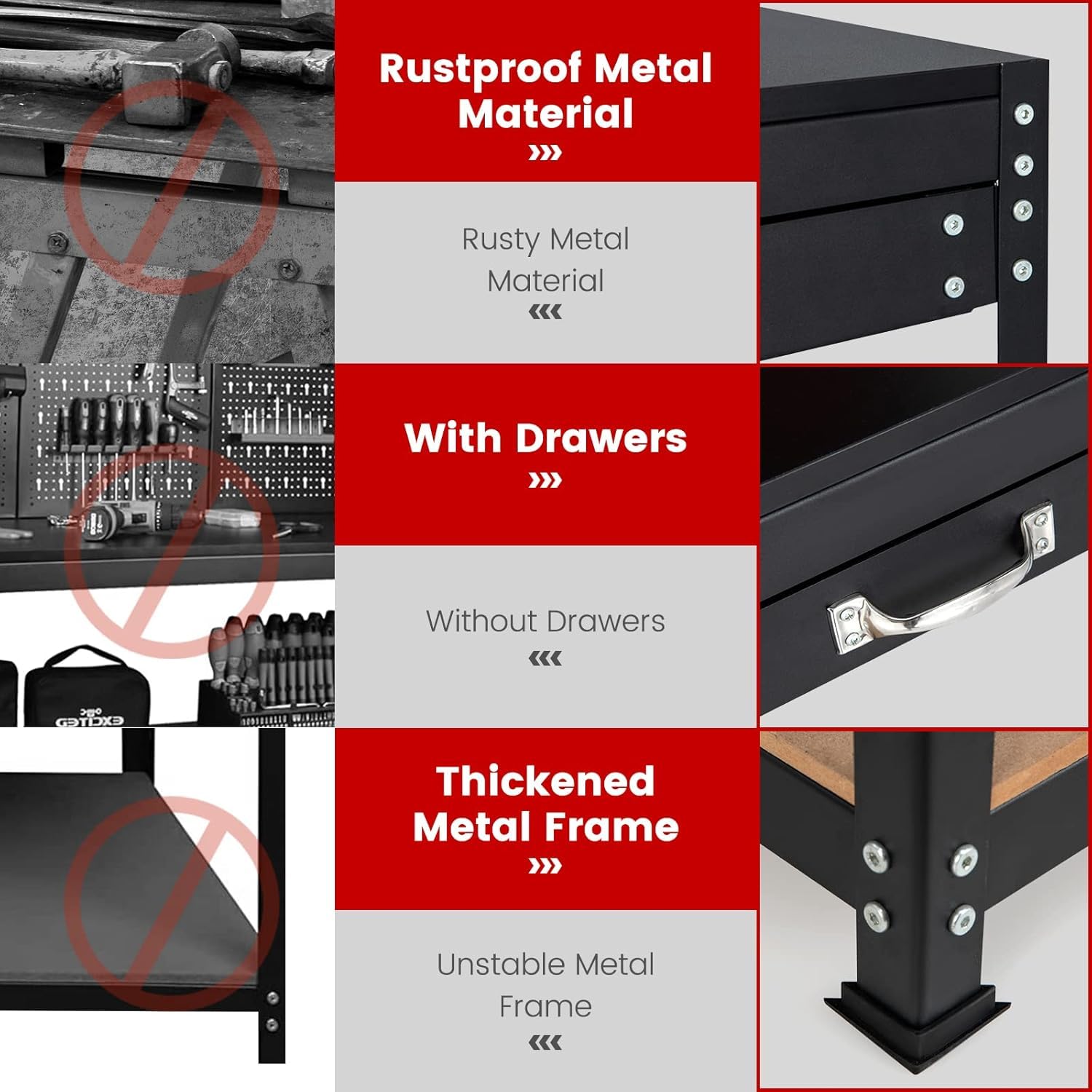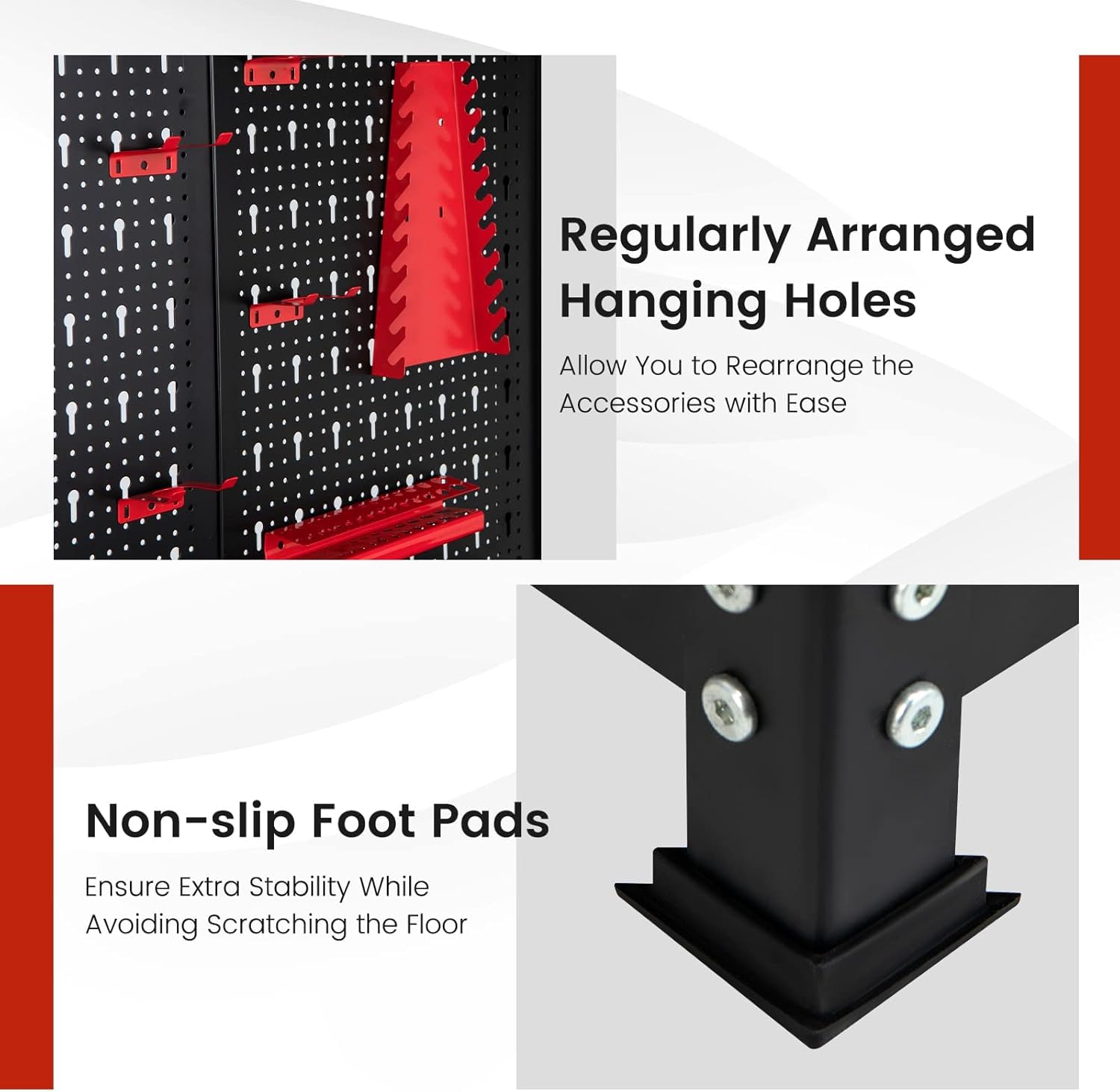 • 【Multipurpose Use】Practical pegboard and drawers make tool bench meets needs for versatile use, perfect for garage, workshop, home use. Whether you’re repairing, working, or DIY, the workbench always makes space tidy and keeps tool within arm’s reach.