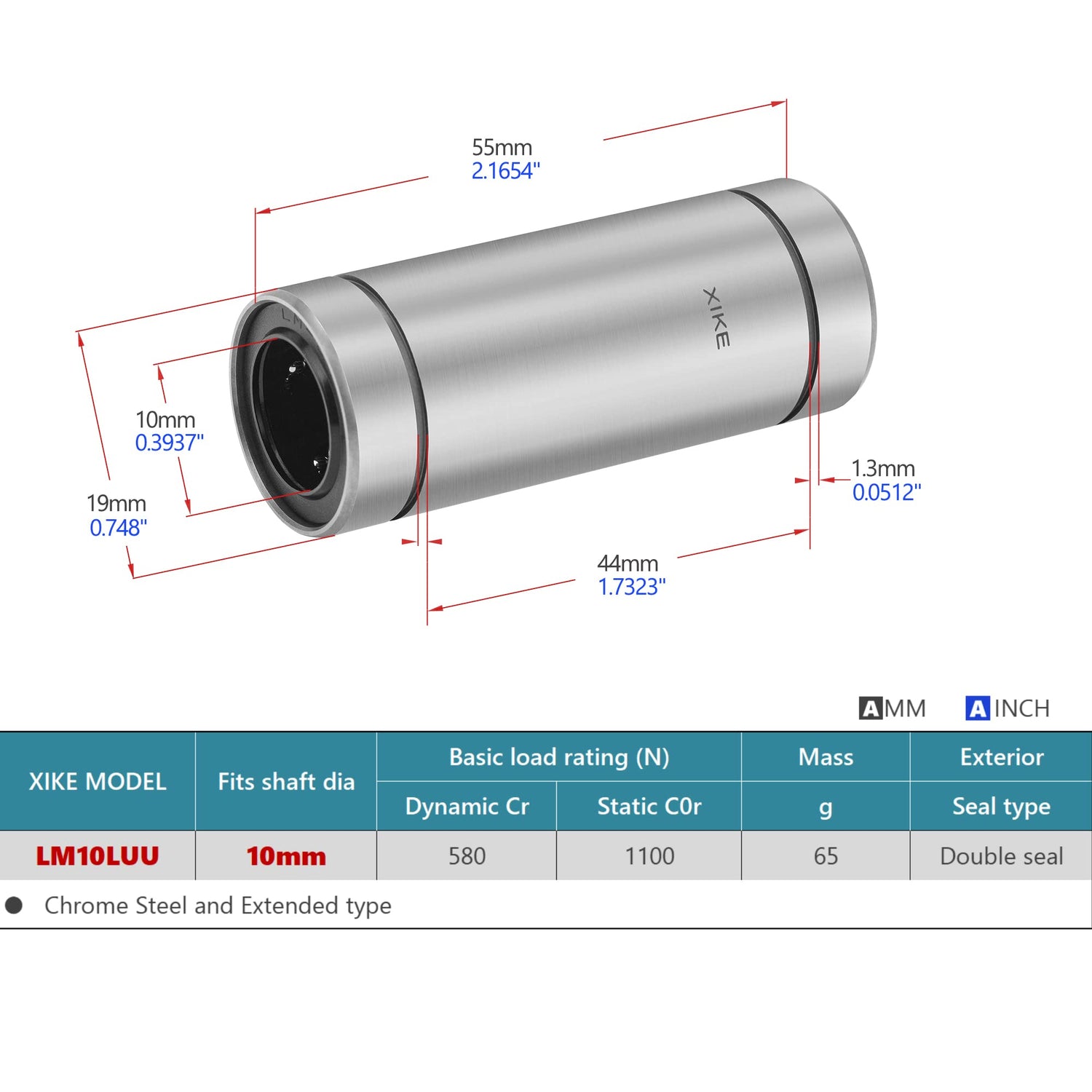 XIKE 2 Pcs LM10LUU Sealed Lengthen Linear Ball Bearings 10x19x55mm,Fits DIY/3D Printer/Workbench/CNC, M4 Rod Shaft Guide Linear Motion System and SCS4LUU Linear Ball Bearings Block Slide Bushing.