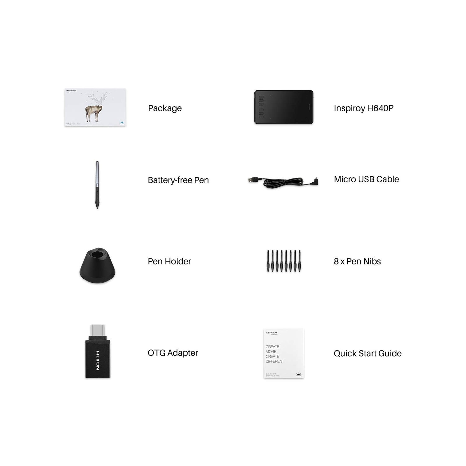 • [Versatile Digital Canvas]: Huion Inspiroy H640P is not only a digital drawing pad, but also a writing pad, signature pad or track pad for your tablet, laptop and desktop. It works well with most creative softwares like Photoshop, SAI, Medibang Paint, as well as many other applications and platforms for online education or remote work like OneNote, Microsoft Whiteboard, Zoom, etc.