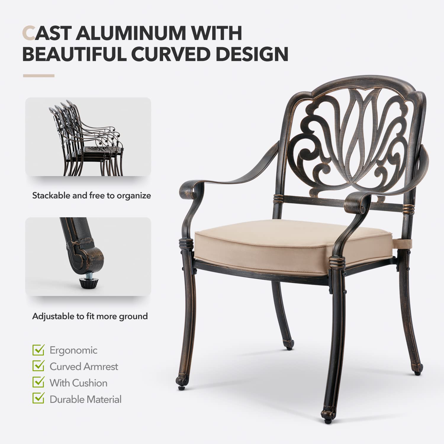 • [BUILT-TO-LAST CAST ALUMINUM] The cast aluminum all-weather patio dining set retains its elegant appearance even after years of age. Our outdoor dining set have been treated with a surface powder coating process, which is rust-resistant, weather-resistant, fade-resistant, and chip-resistant. The patio furniture set features an oil-rubbed bronze finish for a timeless look that is designed to withstand the elements year-round.