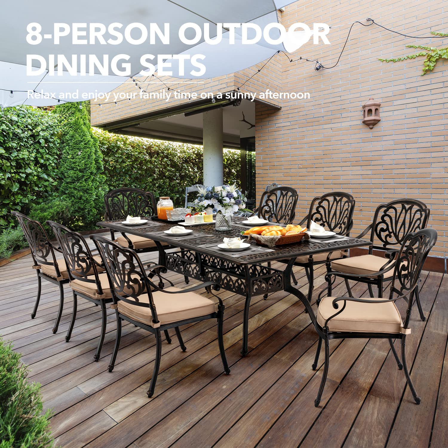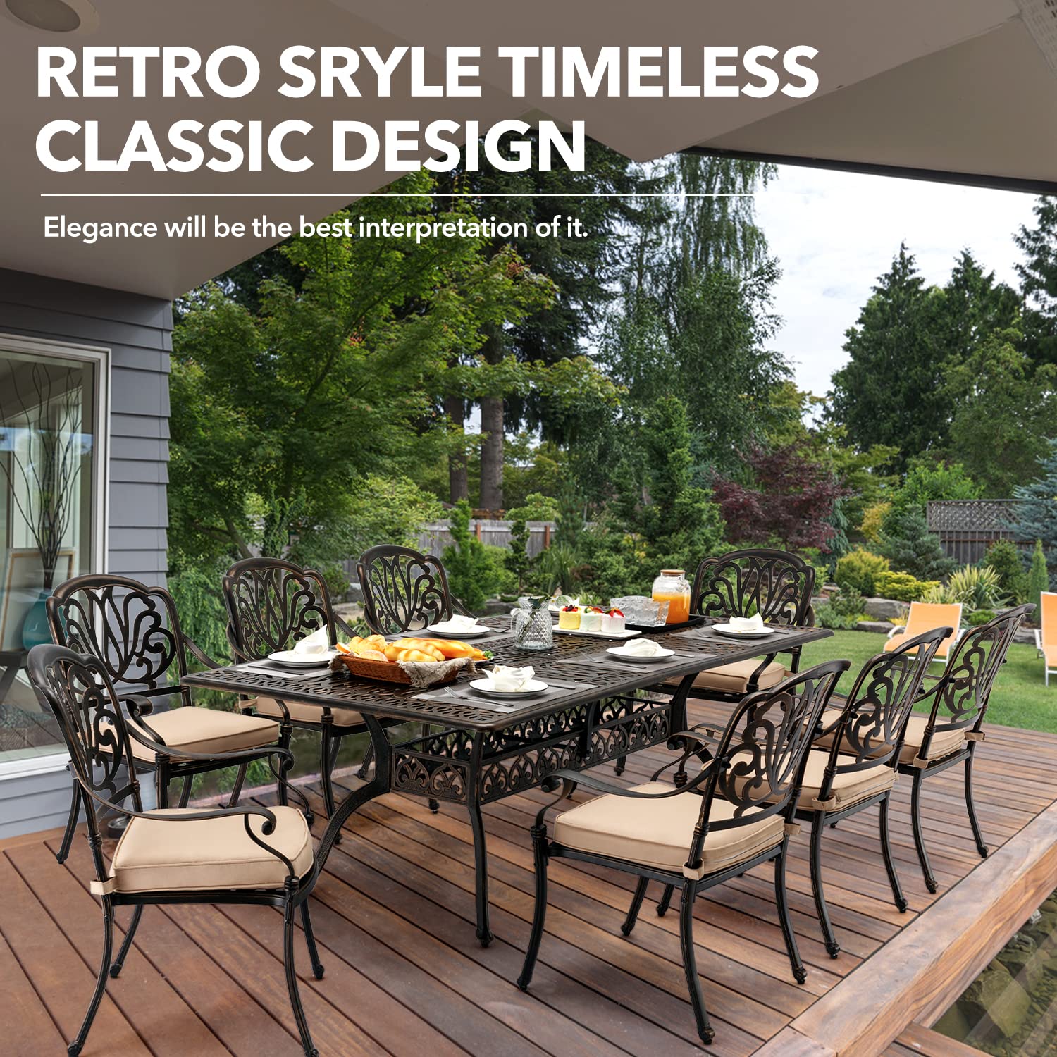 • [CLASSIC RETRO STYLE] This 9-Piece Outdoor Patio Dining Set exquisite beautiful patterned design, combined with the smooth lines of the cast aluminum surface, adds a touch of elegance and luxury to any outdoor scene such as patio or poolside. With accents such as legs and arms, this collection creates an outdoor oasis that evokes comfortable sophistication.
