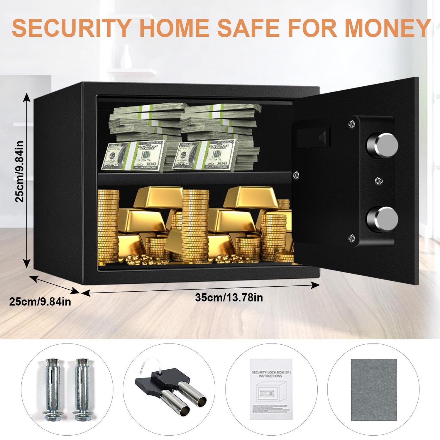 - 🔥🔥🔥【PERFECT SIZE FOR YOUR NEEDS】: External size: 9.84"D x 13.78"W x 9.84"H. This small safe is easy to hidden in cabinets, wardrobes, or bedside tables. Ideal for storing cash, jewelry, passports, medicines, firearms, and more. Perfect gift for homes, hotel, dorm and offices
