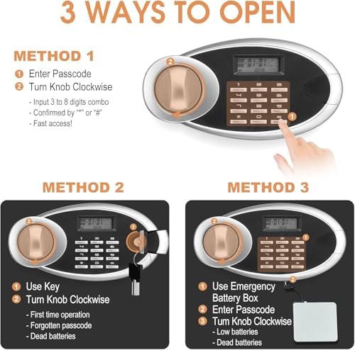 - 🔥🔥🔥【3 WAYS TO OPEN IT】①Personal code/master code+turning knob. ②Emergency keys+turning knob.The first time you get the safe, please use the key to open the door. ③External battery box+personal code/master code+turning knob. Attention: Don't keep the emergency keys in the safe. If you forget the password, you will not be able to open it