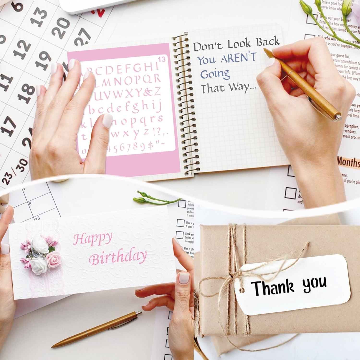 - Wide Application: calligraphy stencils for card making to create different crafts and DIY projects on any surface, such as decorating wood board, paper, canvas, fabric, metal, glass, rock,card, notebooks,shirt,planter box,cake, acrylic, wood tray, garden sign, wall arts, table, cabinet, pillow, furniture, drawing home decor etc.