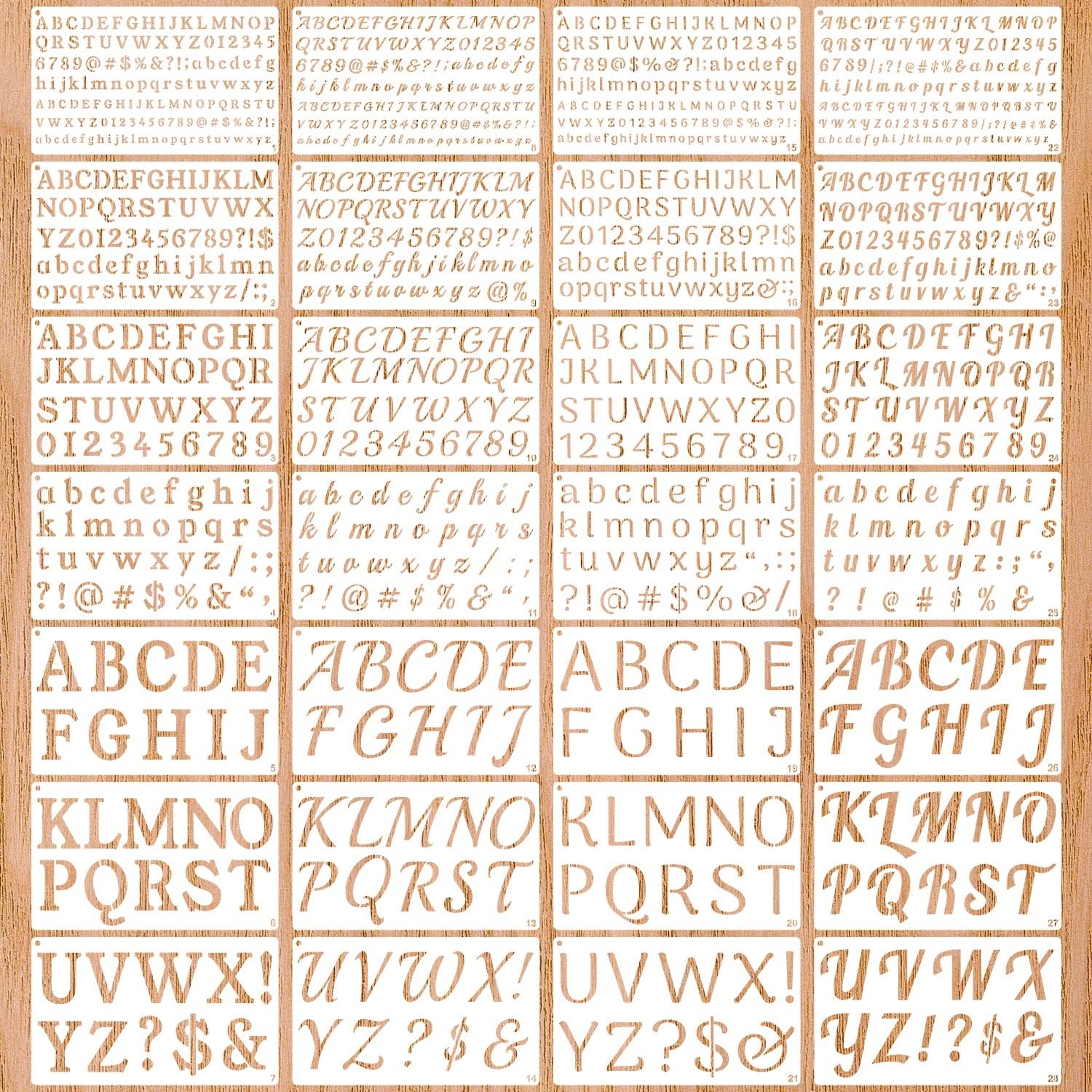 - 【Package Includes】: You will receive 28 pieces letter painting stencils totally, including 4 styles of complete letters, numbers, and punctuation. Each kind of letter has 1/3, 1/2, 3/4, 1, 2 inch. These will give you endless possibilities of customized words to create any DIY art projects as you like. Stencil size: 9.8 inch x 5.9 inch