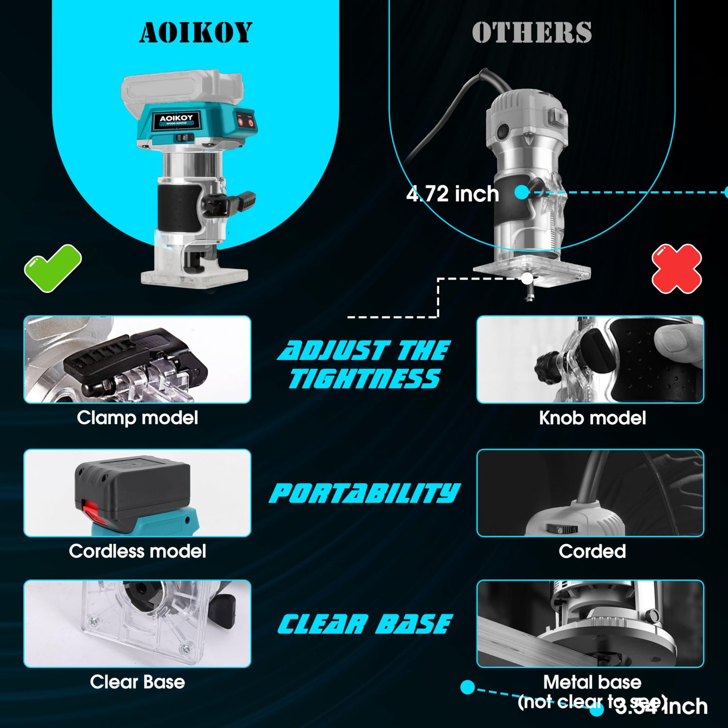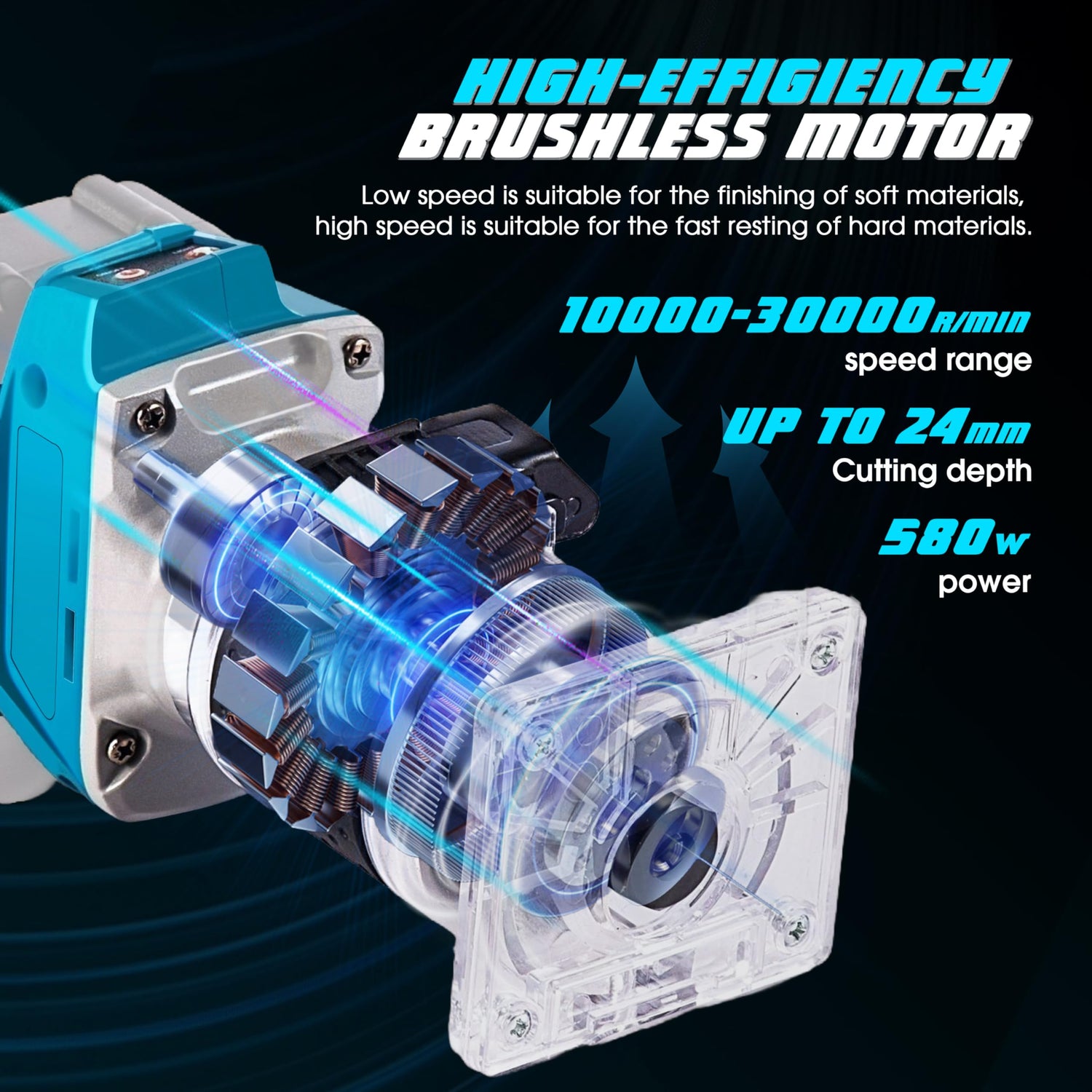 - Note: This trimmer is mainly used for trimming and grooving. The blade included is used for grooving. Powerful Brushless Motor for Optimal Performance ( Compatible with Makita 18V Battery) This router tool is equipped with a high-performance brushless motor delivering 580W of power. With a speed range of 10,000 to 30,000 RPM, it adapts perfectly to different materials. Lower speeds are ideal for soft materials, while higher speeds offer fast and clean cuts in harder materials. A must-have for anyone looking for a versatile hand router.