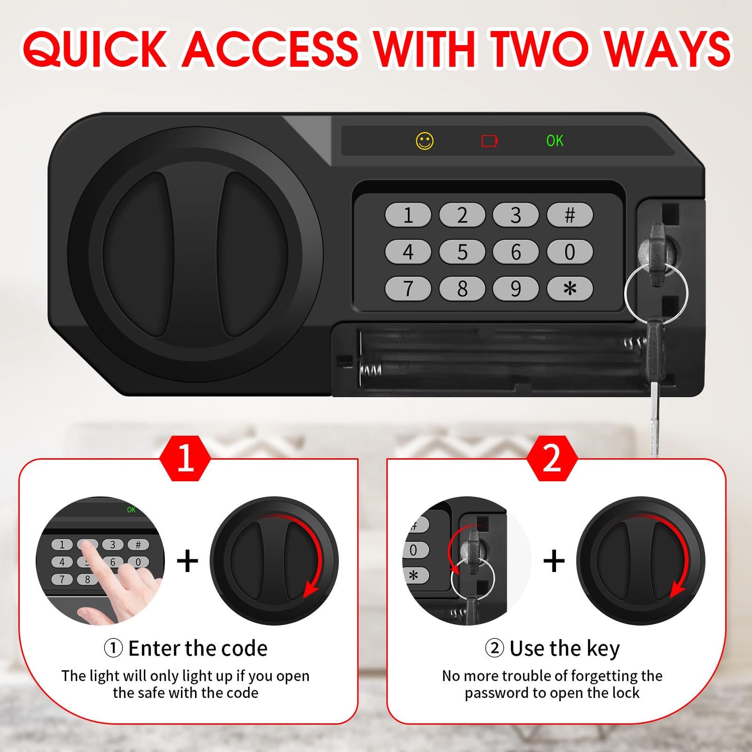 - COMBINATION LOCK BOX: Designed with 3-8 digit PIN numbers and spare keys, you can set a 3-8 digit password for your home security safe. If you forget the password, you can open the safe with the hiding emergency key. There is a unique number on the keyhole, if your key is lost by accident you can contact us to get one
