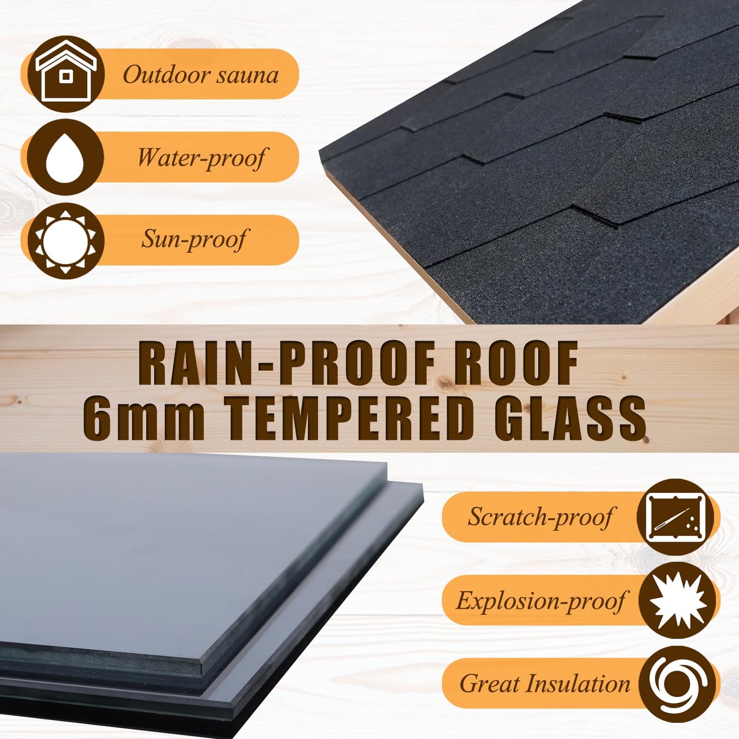 - WOOD DRY SAUNA: Made of natural spruce wood, light weight, water resistance and sun protection,corrosion resistance, is also a good insulation material, with strong, high temperature resistant tempered glass, outdoor service life is reliable