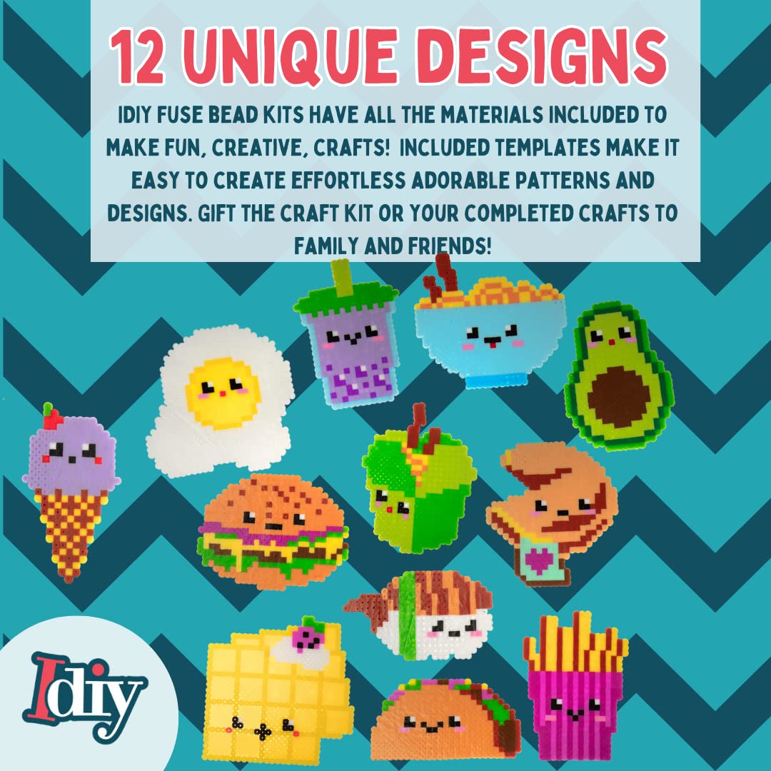 - EVERYTHING YOU NEED - Includes 10,000 beads, 12 unique food inspired templates, 4 pegboards, 2 tweezers, 2 sheets of ironing paper and carrying case. Templates are numbered per color for easy use