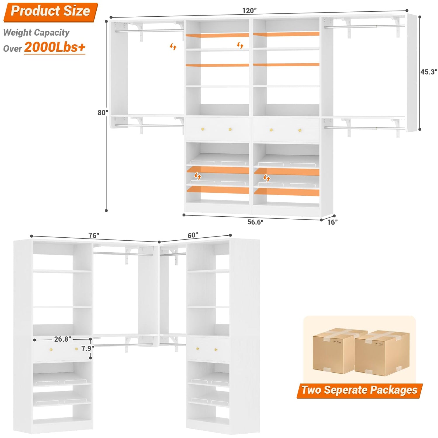- Storage Drawer and Adjustable Shelves: This closet organizer system equip with 2 big storage drawers provides discreet storage for undergarments and accessories, keeping them secure and easily accessible. 2 fixed shelf and adjustable shelf are part of the closet organizers and storage system, providing ample space for storing folded clothes and storage boxes