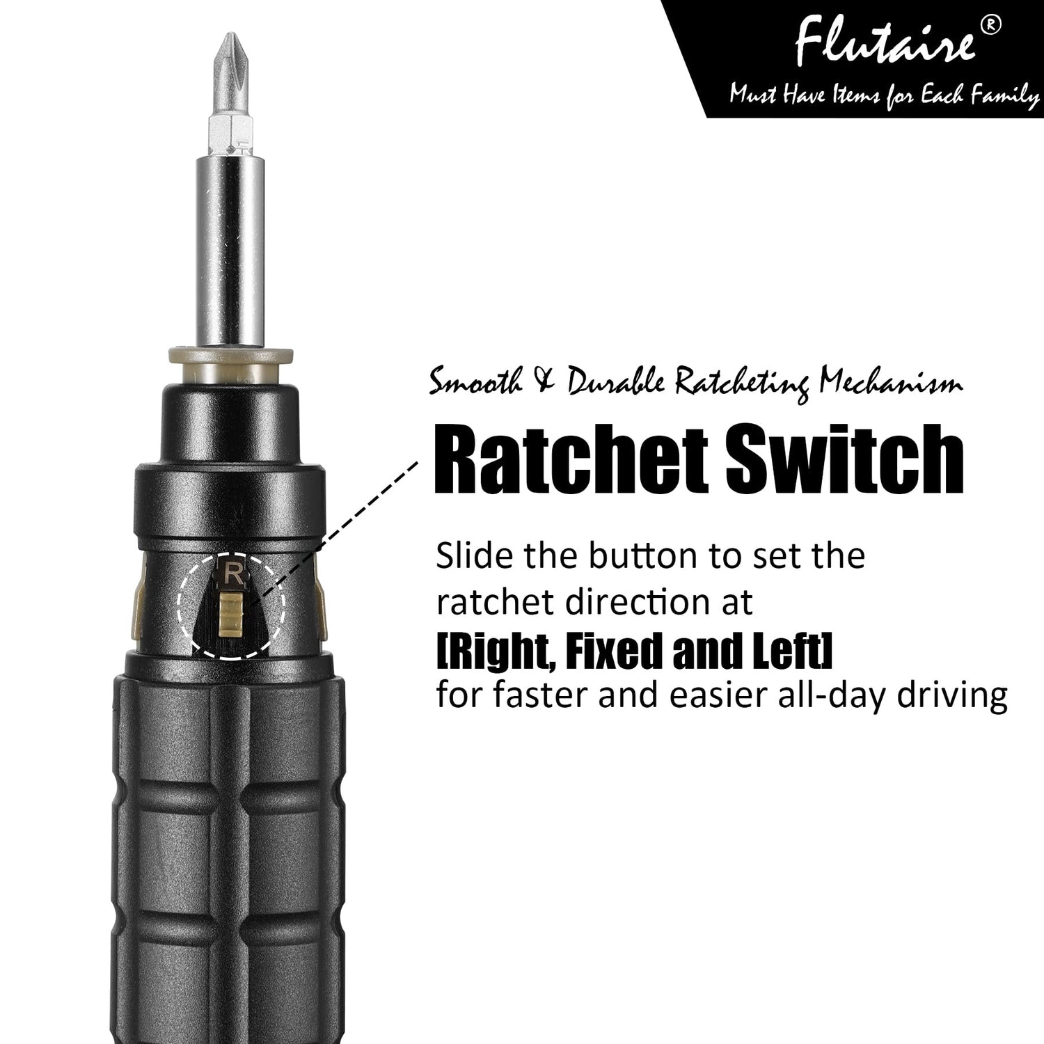 - [Smooth Ratchet Mechanism] Multi-Bit Screwdriver features a durable ratcheting mechanism, simply slide the button to set the ratchet direction at Forward, Fixed and Reverse for faster and easier all-day driving