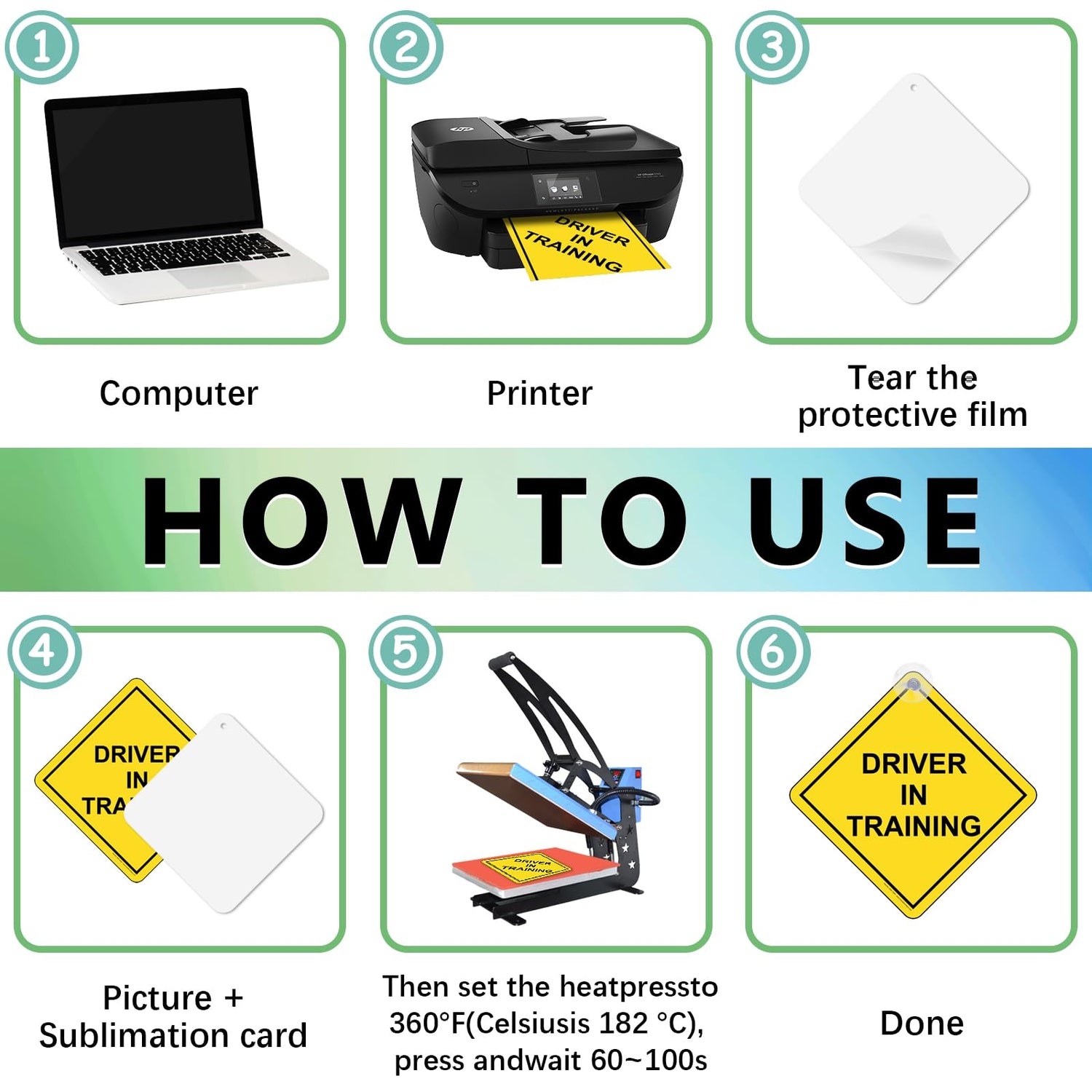 - How to Use: Our Sublimation Car Window Signs sublimation surface is white, aluminum material, They are Sturdy and durable, the surface is not easy to tear,, Before printing, you will need to remove the protective film from the surface of your White surface, It is recommended to set the heat press temperature to 180°C, which is about 354°F, and the sublimation time is recommended to be 60~120 seconds