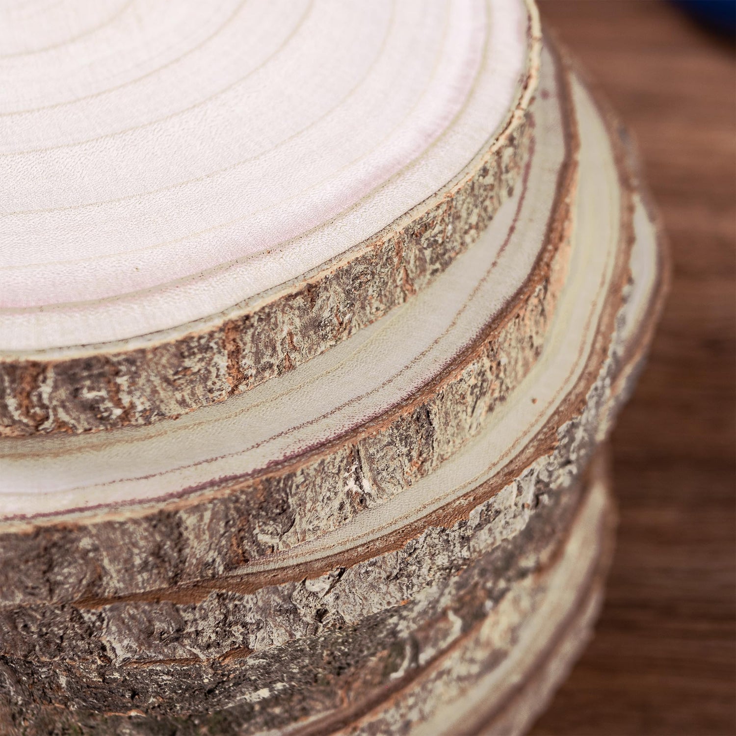 - High-quality wood slices: Cut from natural Paulownia wood with skin, dry, smooth surface, clear texture. Compared with wood slices from other tree species, it is less likely to peel or crack.