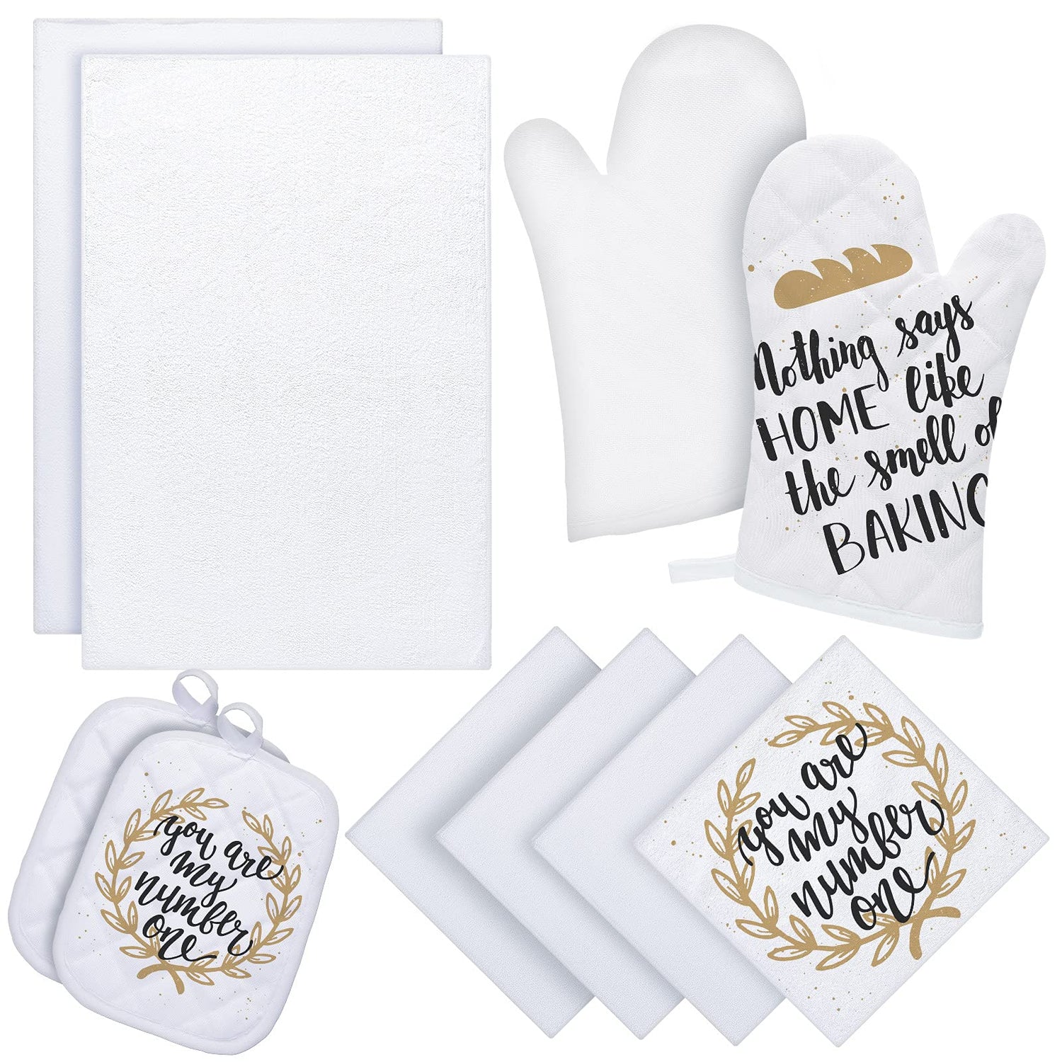 10 Pieces Blank Sublimation Oven Mitts Set Include 2 Sublimation Heat Resistant Oven Gloves 2 Blank Sublimation Hot Pads Pot Holders 2 Towels and 4 Dish Towels for Kitchen Cooking (White)