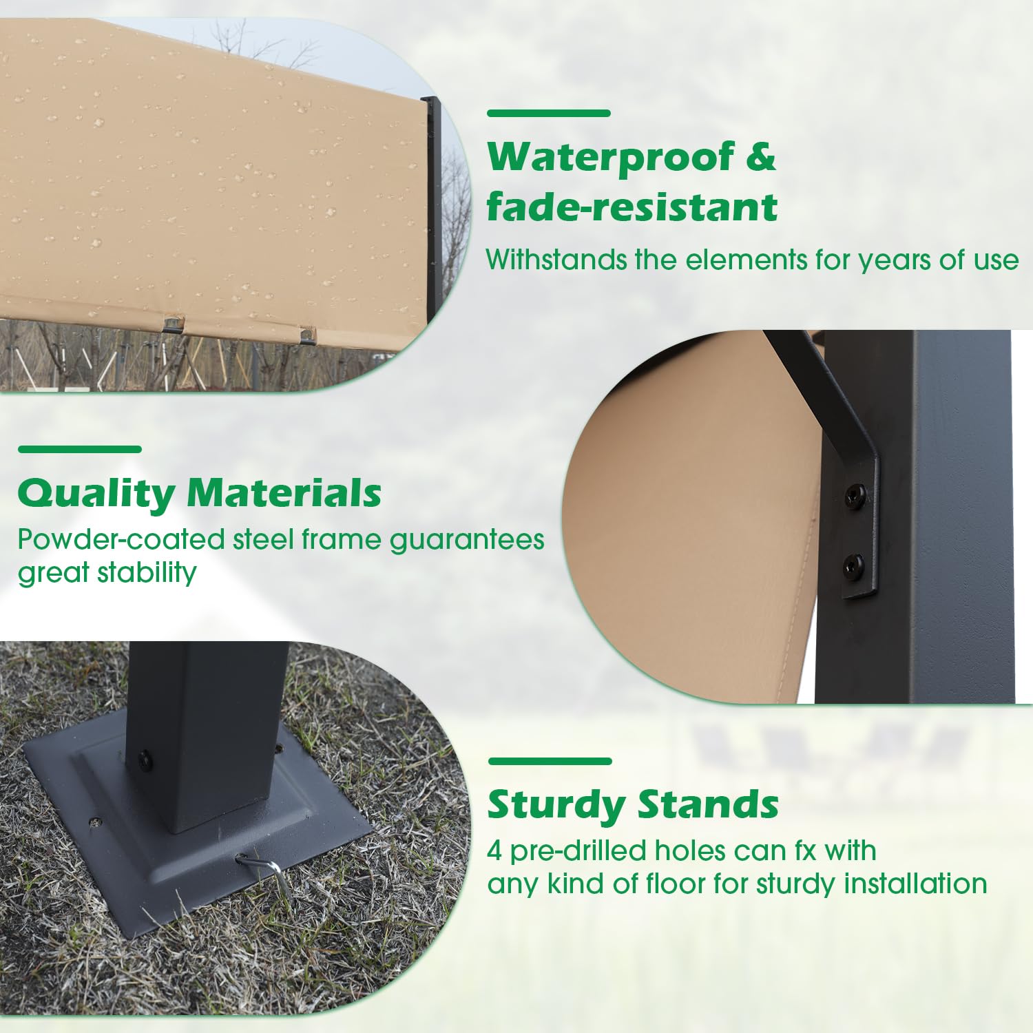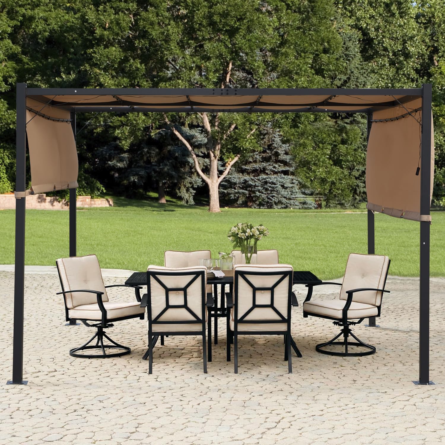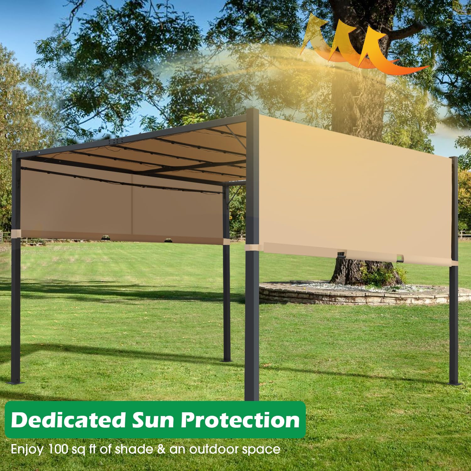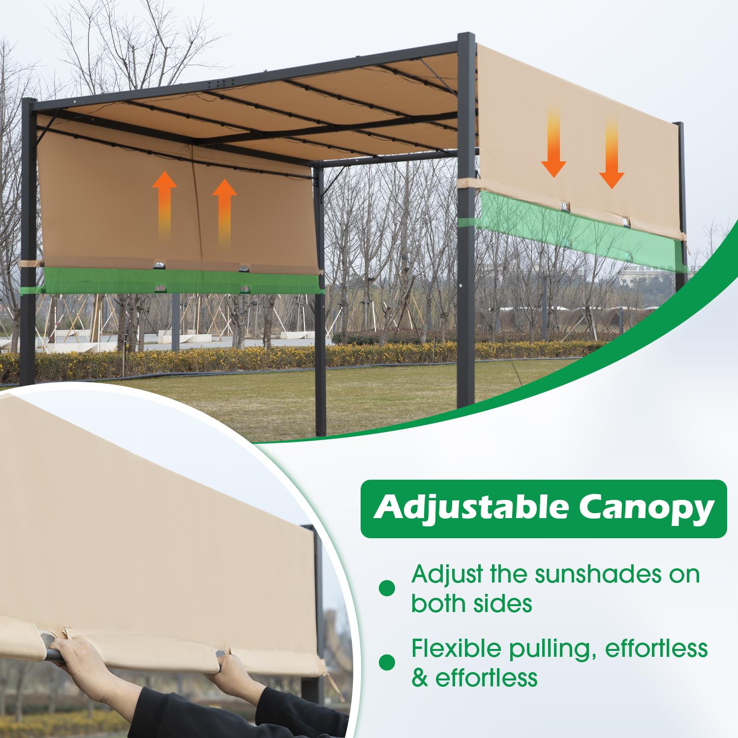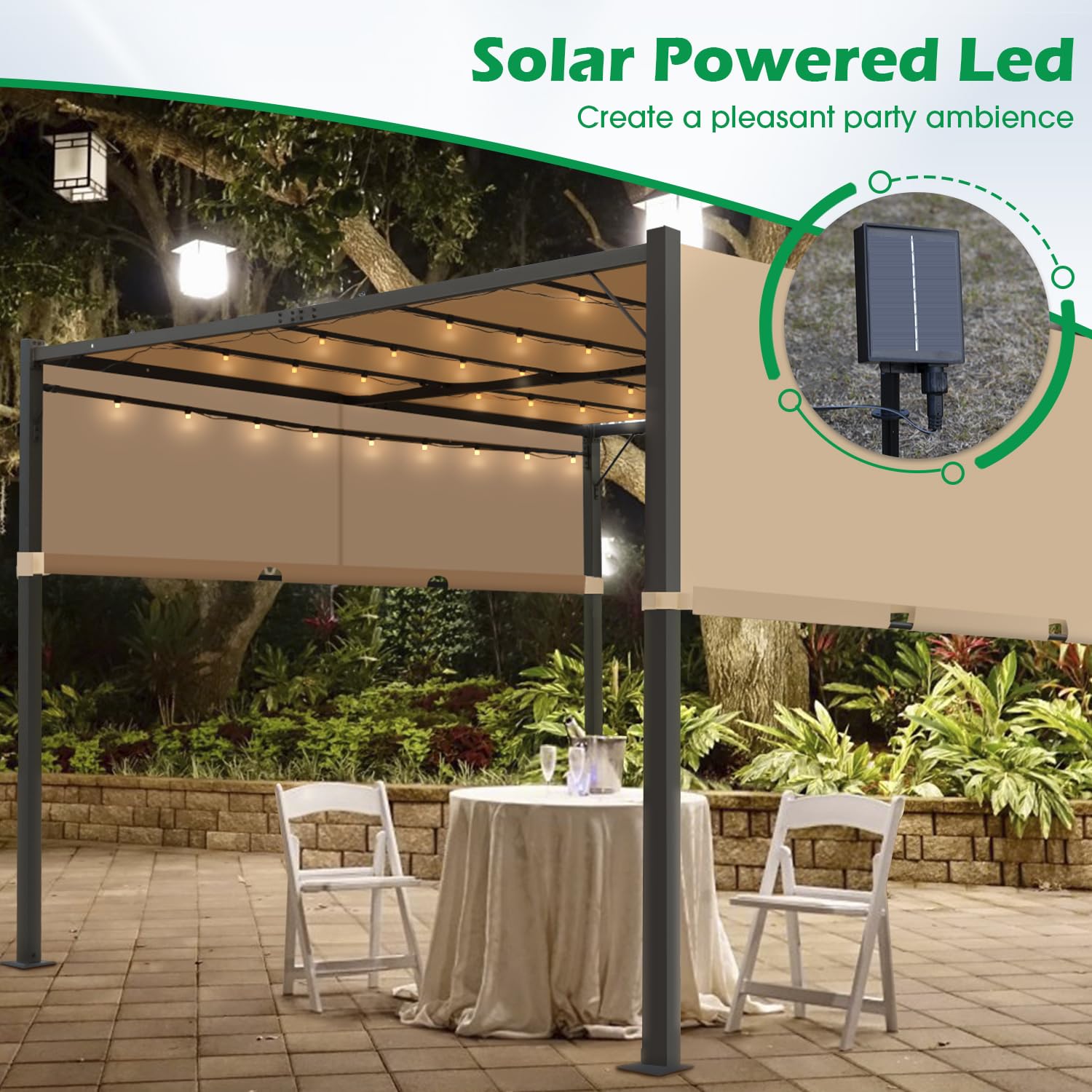 10’ x 10’ Outdoor Pergola Waterproof Gazebo Canopy Sturdy Frame Patio Pergola with Retractable Canopy Sides Solar Led Metal Stands for Porch Party Outdoor Patio Backyard, Tan
