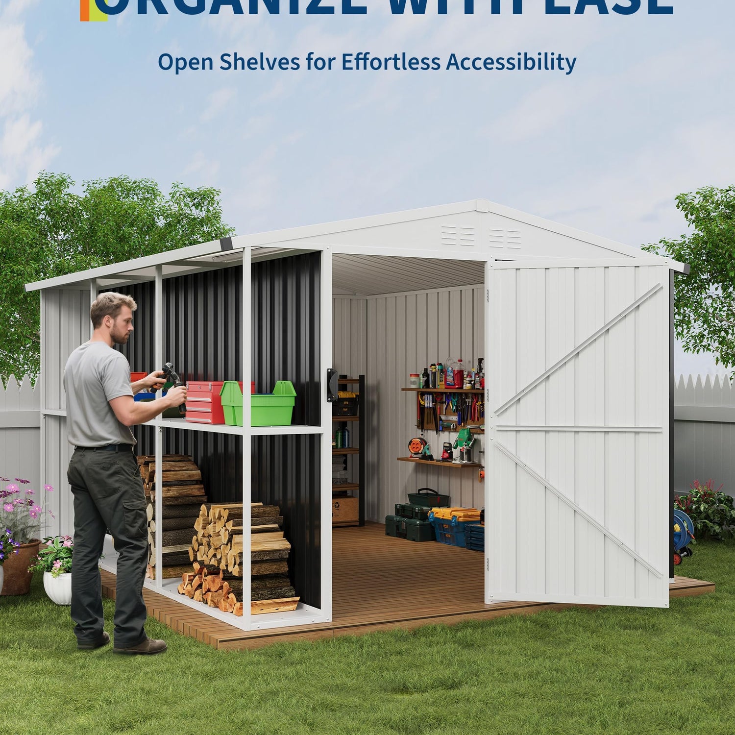 - Convenient Firewood Storage Feature: Equipped with an integrated external shelf specifically for firewood, this outdoor storage shed offers a dedicated spot to neatly stack your firewood. The design allows for proper air circulation, which helps keep the wood dry and in optimal condition, ready for use whenever you need to light a fire.