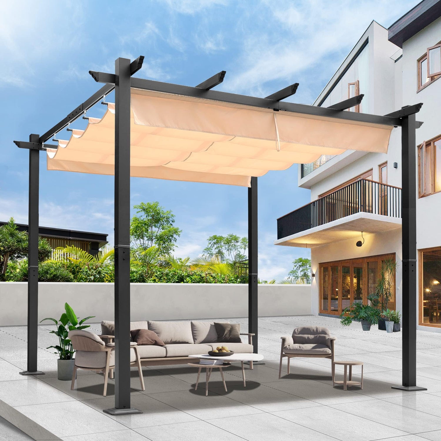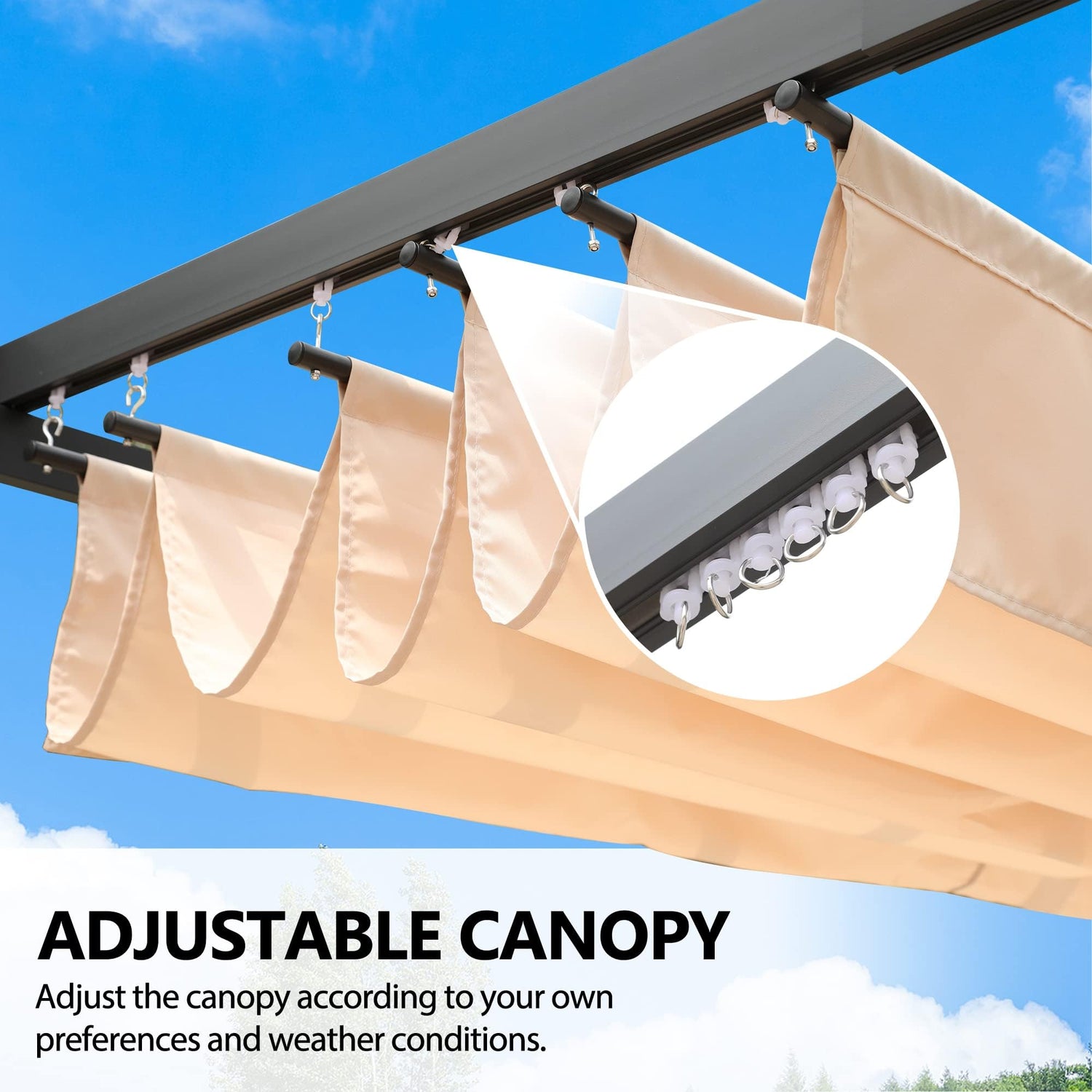 - QUALITY RETRACTABLE PERGOLA CANOPY - The retractable pergola canopy is made in sturdy 180g/m² fabric with level 5+ PA coating, which made the canopy have better UV protection and water resistance abilities. Brings people more shelter from the sun and enjoyment in the hot summer. And the canopy can be removed in the event of high winds or during the winter months.
