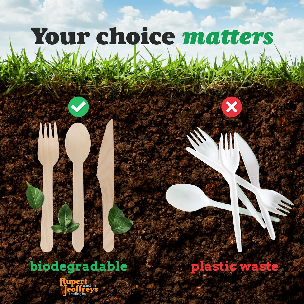 Details: These 6 inch long cutlery sets are sturdy, disposable, and biodegradable. Experience unmatched durability with our birch wood utensils, designed to excel under pressure. Crafted from premium birch, known for its superior strength over oak, these utensils promise to elevate your culinary adventures with both resilience and style!