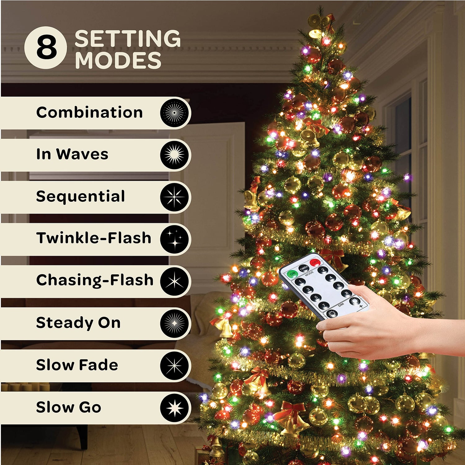 - 8 LIGHTHING MODES: Options include (1 combination, (2 wave, ( 3 sequential, (4 slo glo, (5 flashing, (6 slow fade, (7 twinkle, (8 steady on, Choose style according to suit your moods and the atmosphere you want to create your christmas lights outdoor