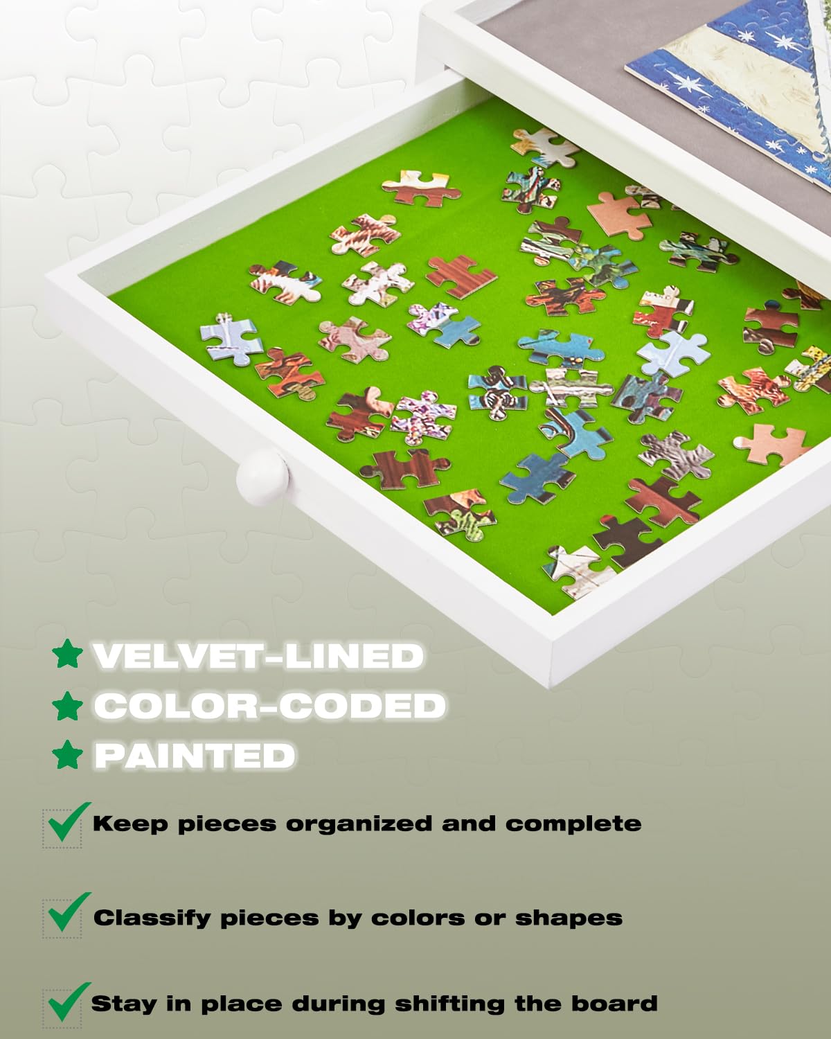 - Reinforced Sliding Drawers: This puzzle table includes 4 sturdy, velvet-lined, color-coded drawers with magnetic closures for secure storage. Effortlessly organize pieces by shape or color, keeping everything neatly sorted and protected as you work