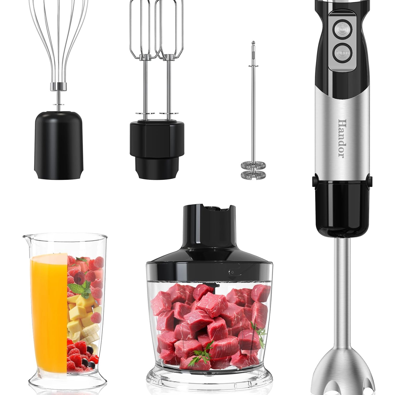 - Versatile 6-in-1 Set: Unleash your culinary creativity! Our set features a hand blender, egg whisk, 600ml beaker, 500ml food chopper bowl, and milk frother. It's not just a blender; it's a kitchen multitasker.