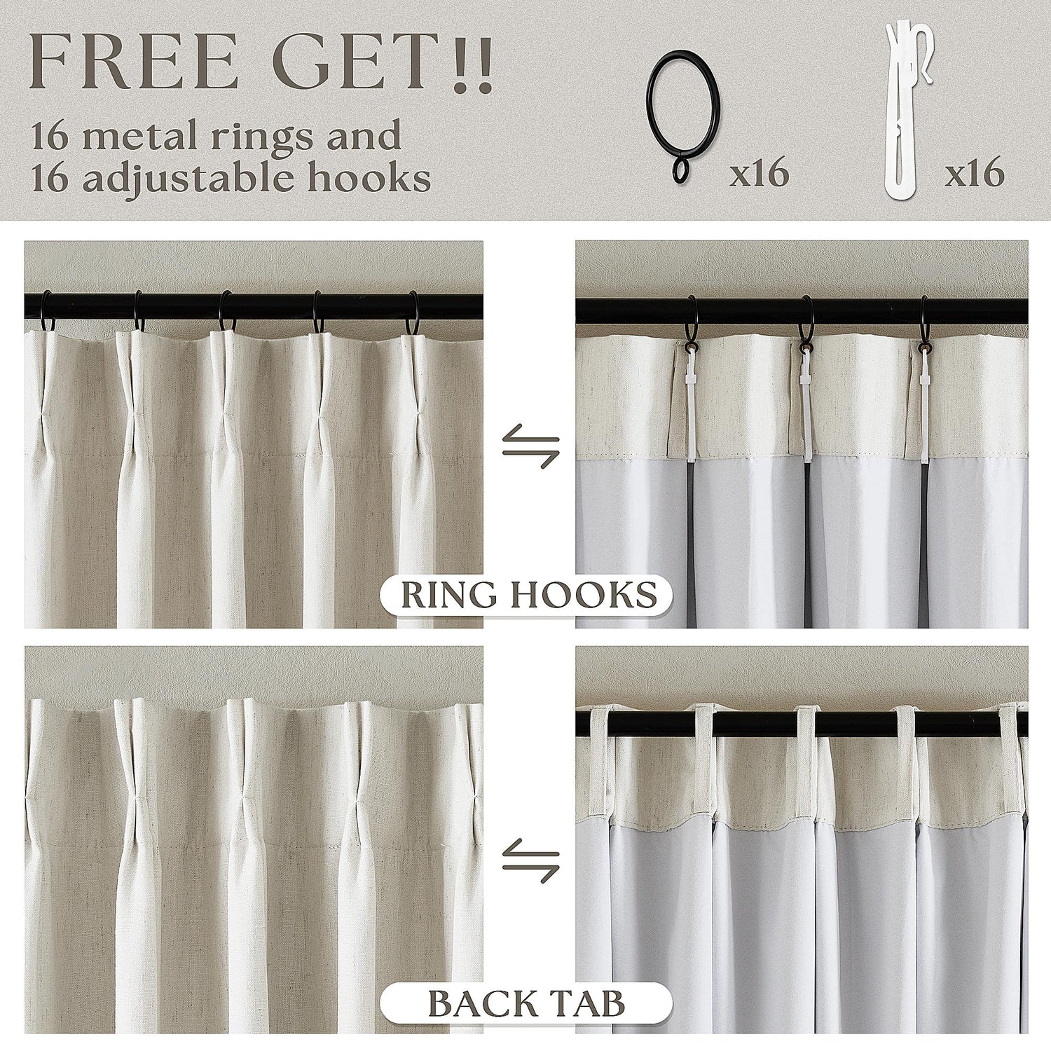 - Versatile Hanging Options: Method 1: Hanging with our hooks and rings to easy slide and creat a classic pleated effect. Method 2: Using back tab to hide the rod, easy to hang and showcase a casual look. Method 3: Using our adjustable hooks for track system. Method 4: Using clip rings(not included). Install according to your preference