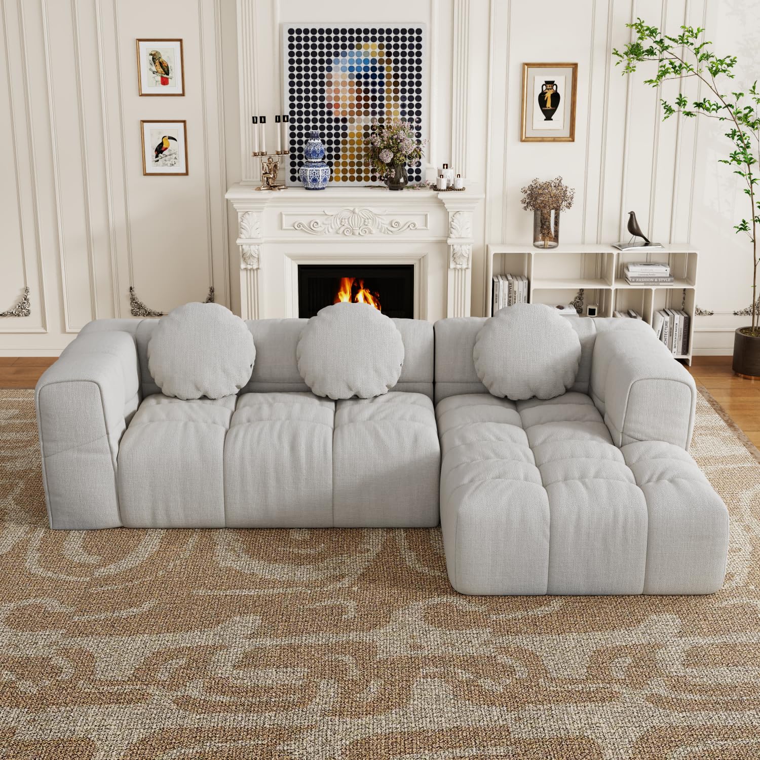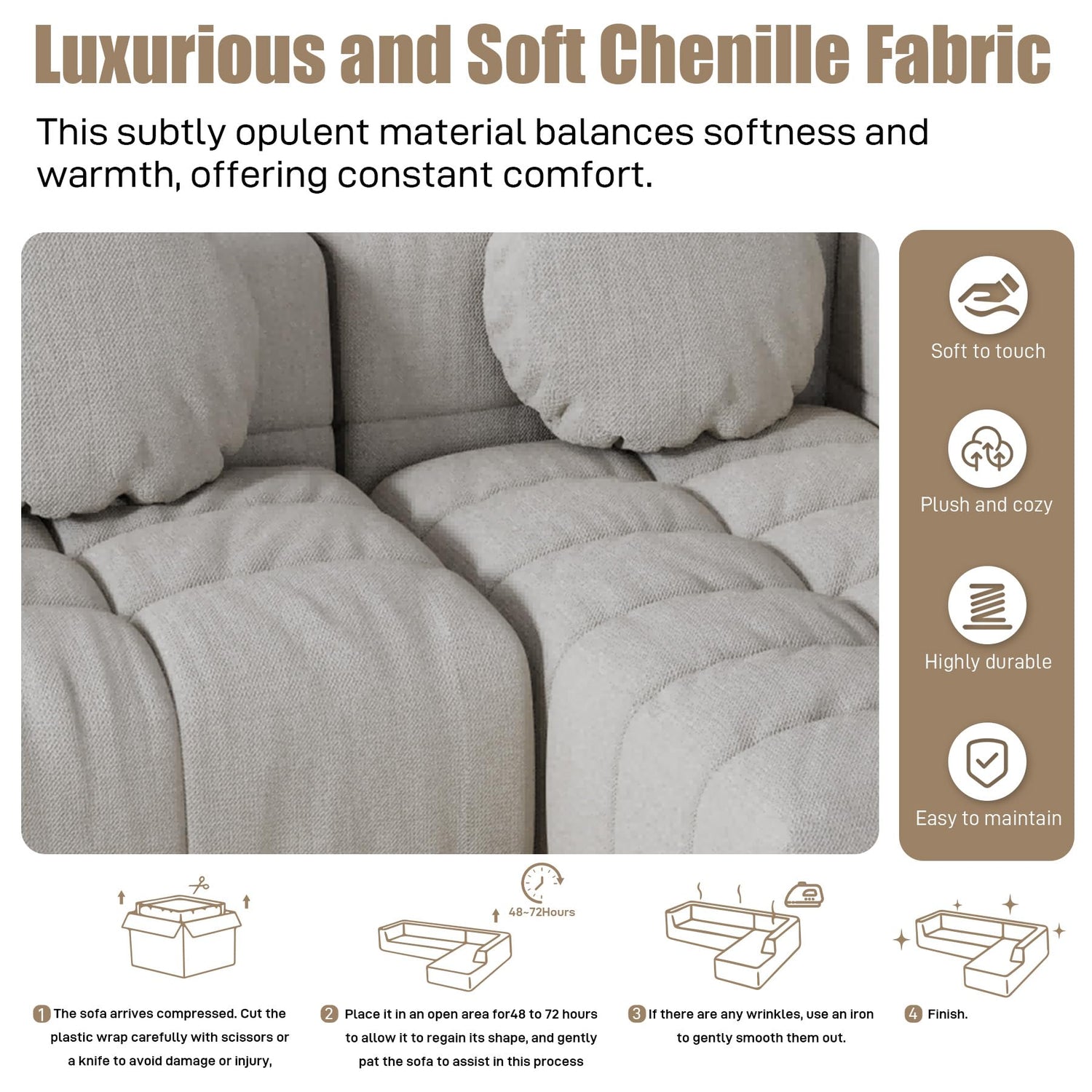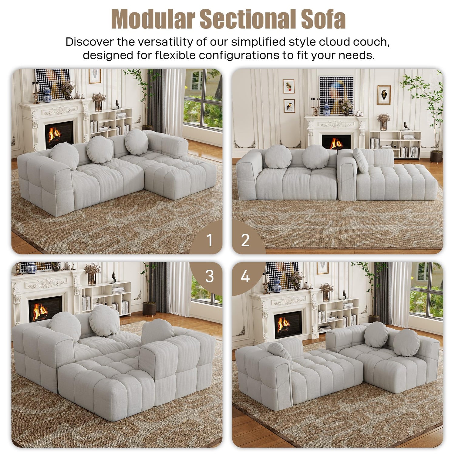 - No Assembly Required Sectional Couch: Escape the typical furniture setup hassle with our boneless cloud couch. Simply unbox all parts and lightly tap each segment to boost its springiness and poof, bringing it back to its photogenic glory. Complete revival may take up to around 72 hours. Delight in the ease of a no-assembly