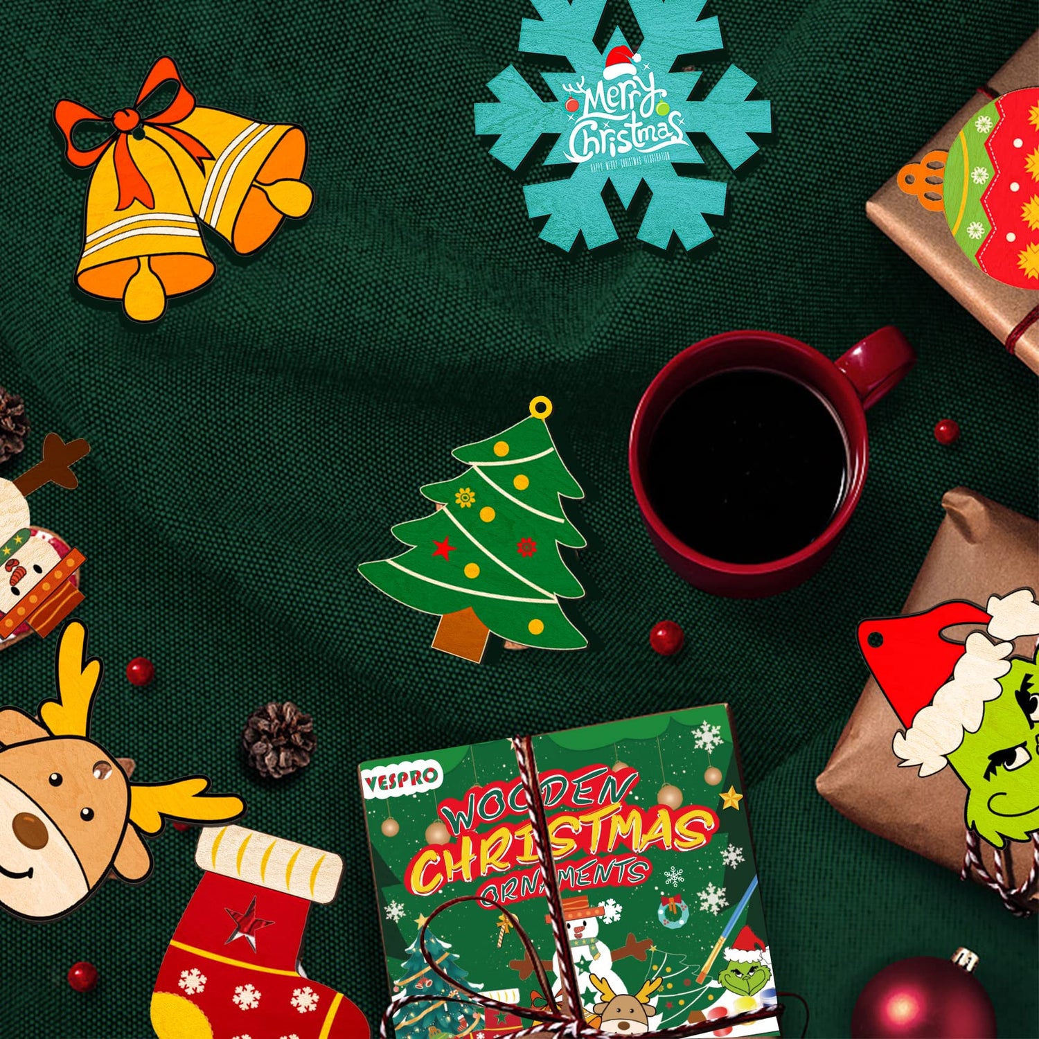 104PCS Wooden Christmas Ornaments Craft Kits Include 40PCS Unfinished Wood Slices with 8 Styles,Xmas Tree Hanging Decorations DIY Craft for Kids to Paint