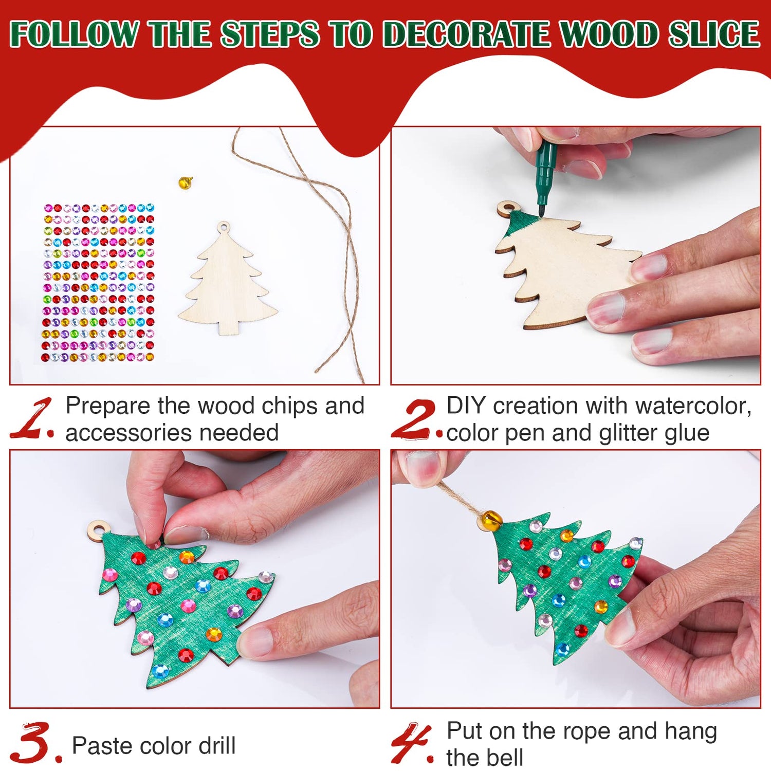 - 【PACKAGE CONTENT】:Christmas wooden ornament craft kit contains 40 Unfinished Wood Slices with 8 differrnt Christmas unique designs, 1 rope(33 feet), 12 colors watercolor paints,2 paint brushes with different brush heads,1 gold glitter glue,1 silver glitter glue,1 diamond sticker,1 small paint tray,6 colors washable markers and 40 bells.Rich Ornament Kits contents can make kids' Christmas icrafts more perfect.